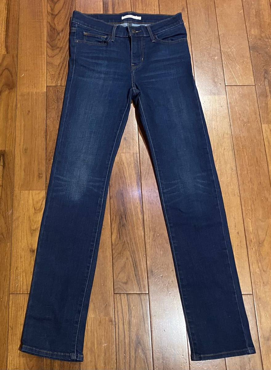 リーバイスのストレッチデニム(ジーンズ)、SLIMMING SLIM 36766-0004です。色はインディゴブルーです。USEDで7分丈に裾直ししておりますが状態は良いです(10段階中8程度)。生地はストレッチ入りで綿70%、ポリエステル28%、ポリウレタン2%です。紙パッチ、ジッパーフライです。正規品です(パキスタン製)。サイズはW27×L30でウエストは重ねずに平置きで約74cm、ヒップ約80cm、股上約23cm、股下約78cm、股下15cmのふともも部分約42cm、裾まわり約32cm、重量約450gです。