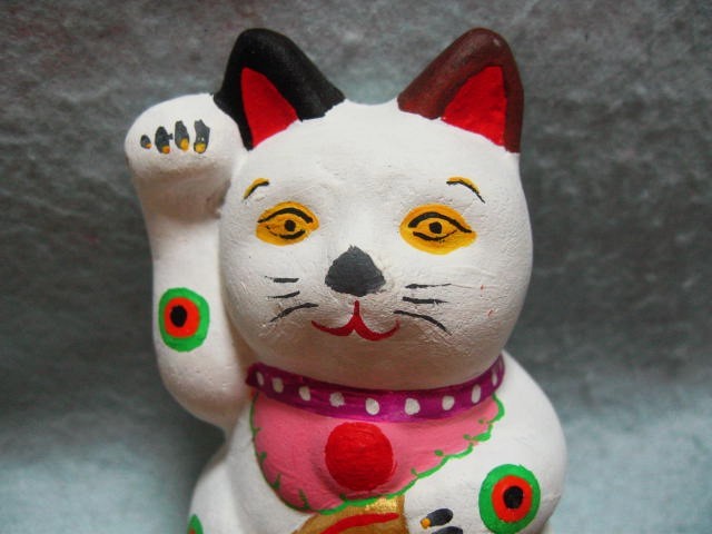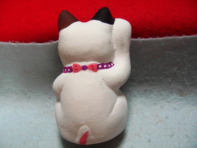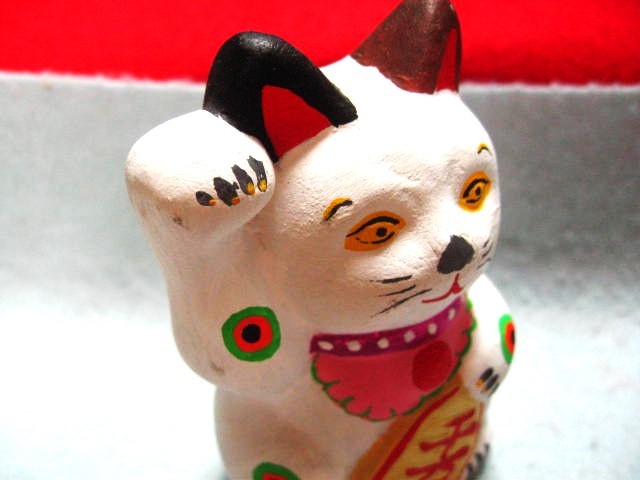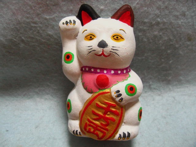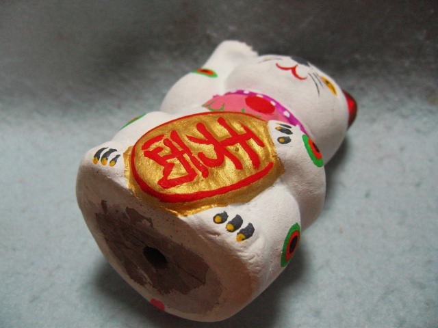 大変風合・時代感ある可愛らしい千万両持ち招き猫土人形 です。