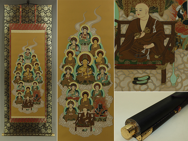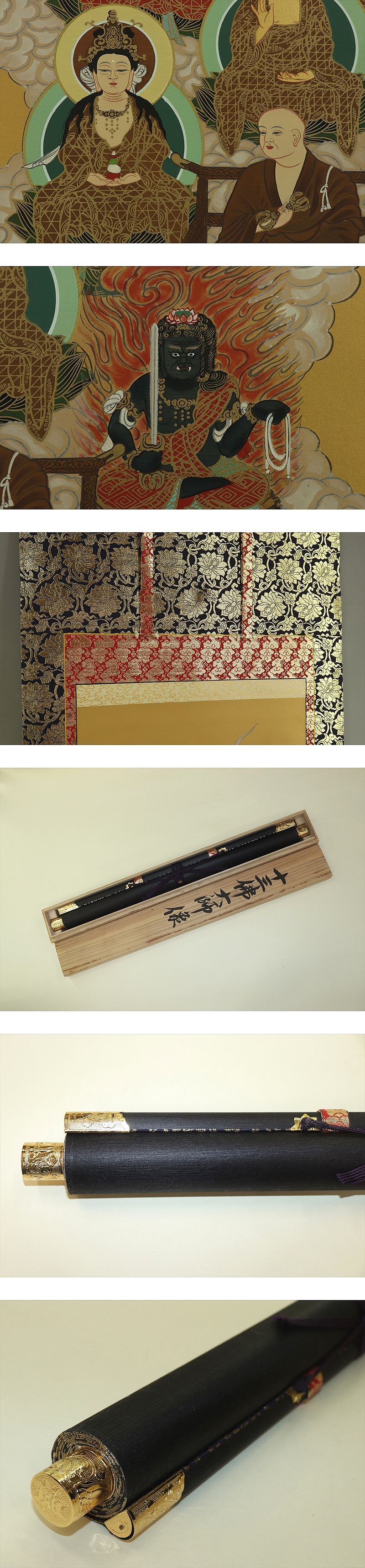 仏画 【真言十三佛】 本紙は、概ね良好です。 表装は、染みがあります。 【サイズ】 作品 横約39cm×縦約97cm 表装 横約55cm×縦約151cm |