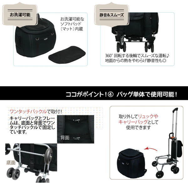 【スイートハート 4WAY】1.カートとして使用2.キャリーバッグとして使用3.車のシートベルトを付けてドライブキャリーとして使用4.リュックとして使用★リュックは背負っている時に肩からベルトがずり落ちないように、 バストの高さに両サイトのベルトを固定するパーツがついています。 ★カートとしての使用時、ハンドルを傾斜しても、バッグは垂直のまま。ペットへのストレスを軽減できます。★ペットの突然の飛び出しを防止する【飛び出し防止金具】が付いていますのでとっても安全です。■サイズ:約53×34×99cm、(折りたたみ時)約41×19×61.5cm、(バッグ)約53×30×32cm■総重量:約5.5kg ■適応体重:約~12kg■材質:(カート)スチール、プラスチック、(バッグ)材質:スチール、ポリエステル、ナイロン●リュック内のクッションが少し大きめに作られているためたいらにはなりません。(少し反ったら(盛り上がった)感じになります。不良ではございませんので、予めご理解の程お願いいたします。