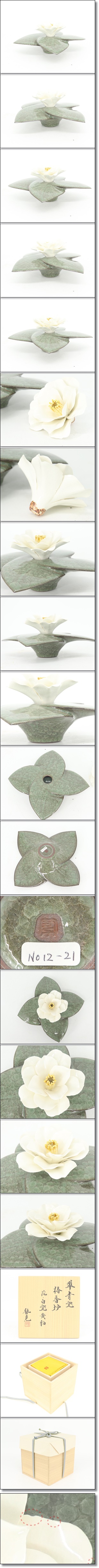 【蔵】希少品 峯岸勢晃 椿香炉 花・白瓷黄釉 翠青瓷 香炉 花 煎茶道具 共箱 共布 栞付 本物保証 百貨店購入品 Y1250