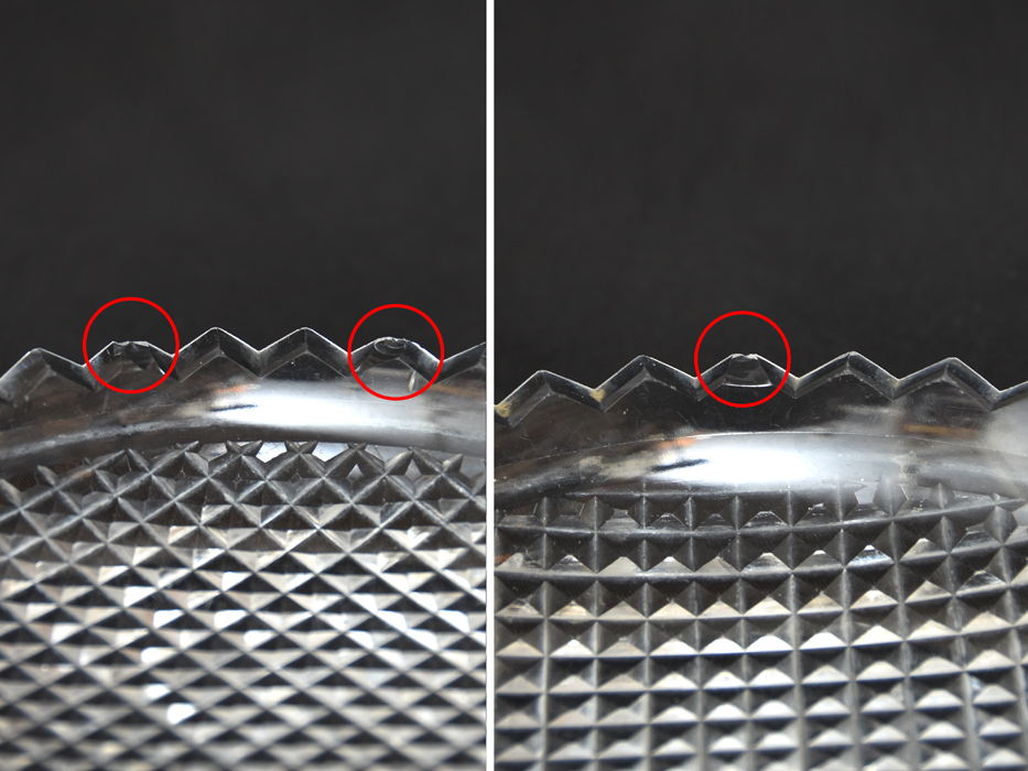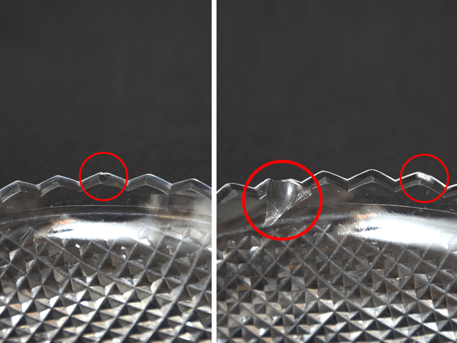時代 切子 ガラス 魚子紋 銘々皿 4客です。 透明感のあるガラスを丁寧に切り、魚子紋を出しています。 魚子紋は魚の卵が並ぶ様子から名付けられ、子孫繁栄の意味が込められている大変縁起の良い伝統模様です。 それぞれ縁にカケやホツなどが見られますが、それ以外は問題なく良い状態です。 ※撮影の際に生じた写り込みなどがございます。 ご理解の程よろしくお願い致します。 |
