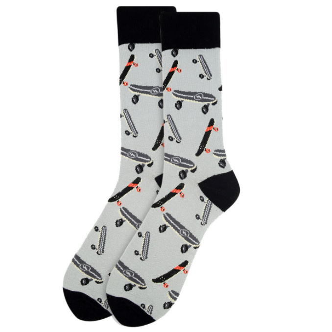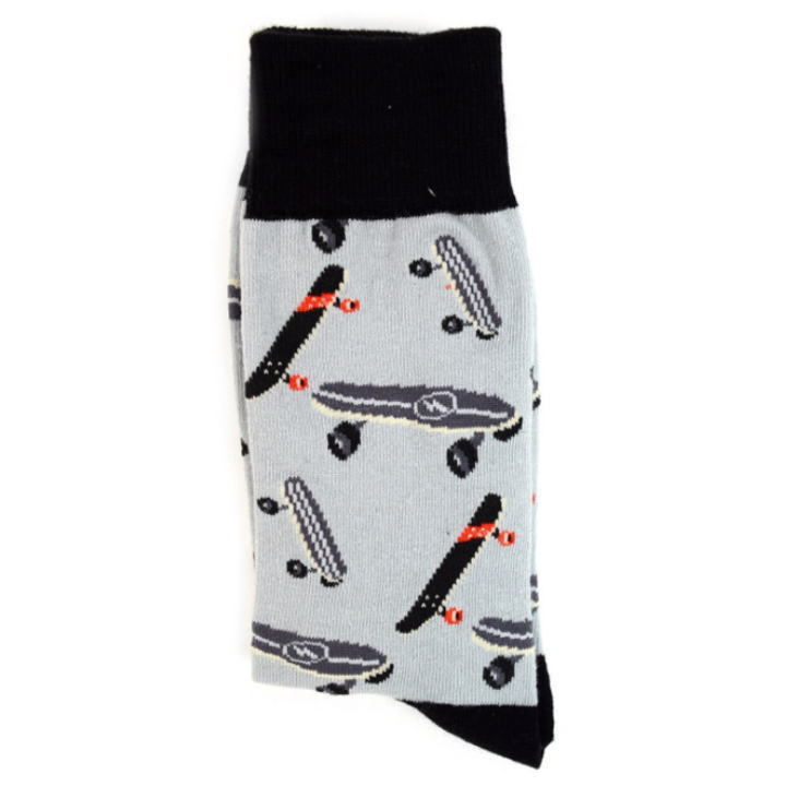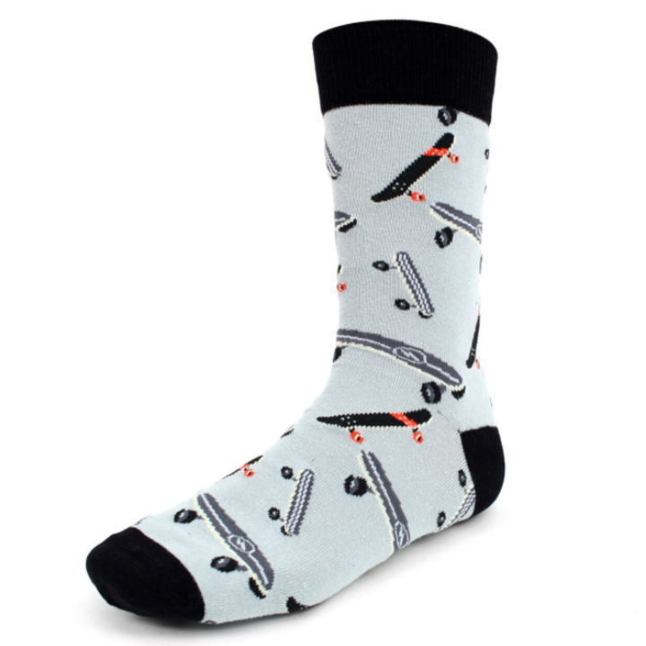 異なるデザインのスケートボードが散りばめられて描かれた靴下です。