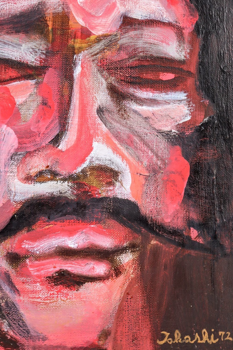 真作 藤沢喬 1972年 油彩「神 (5)」画寸 F3 中国大連出身 自由美術家協会会員 黒と赤を基調に力強い筆致でインパクトあるキリスト 8155