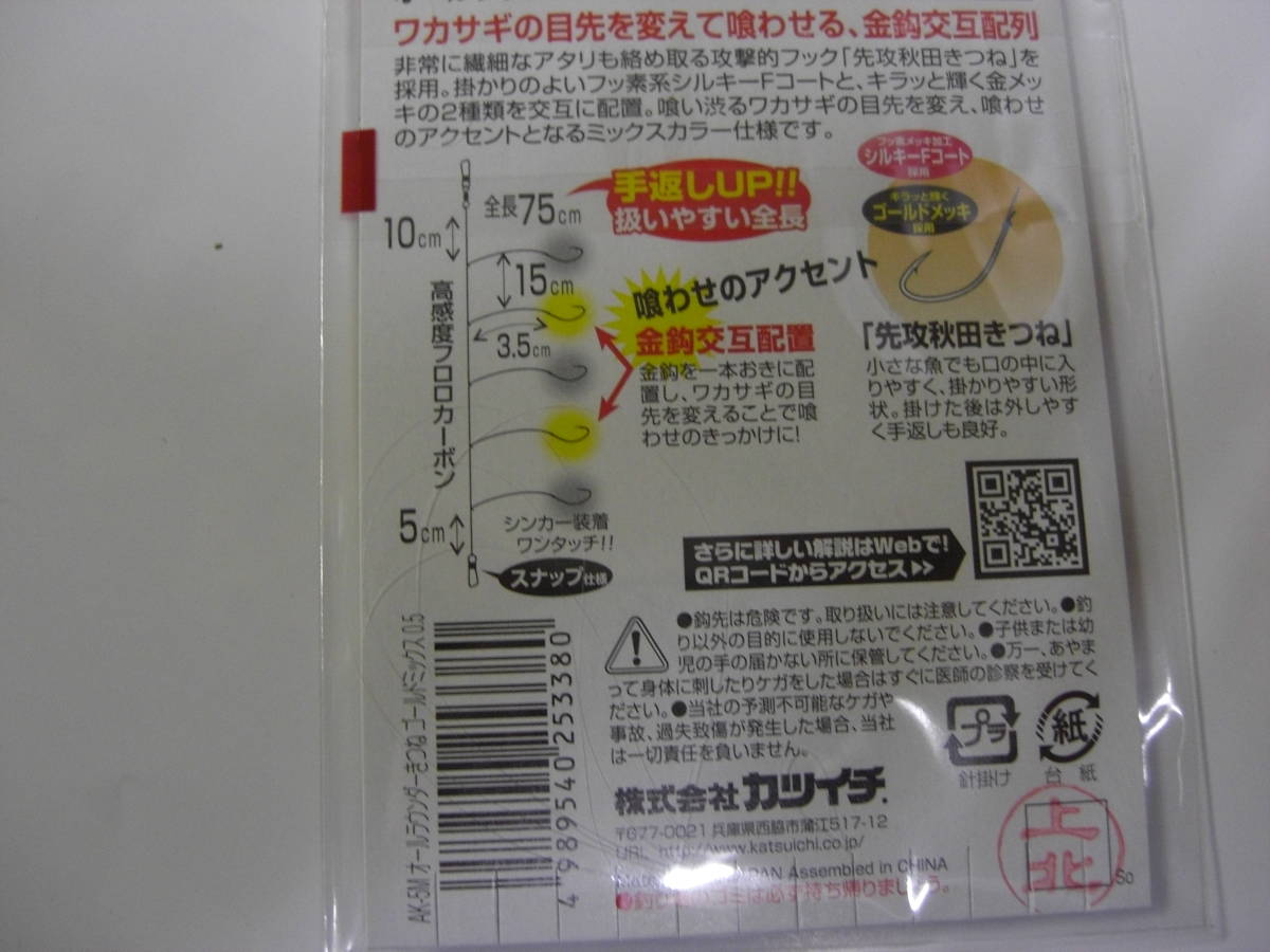 ♪商品説明♪ | 喰い渋ったワカサギにアクセント!金鈎ミックス仕様 非常に繊細なアタリも絡め取る攻撃的フック「先攻秋田きつね」を採用。掛かりのよいフッ素系シルキーFコートと、キラッと輝く金メッキの2種類を交互に配置。喰い渋るワカサギの目先を変え、喰わせのアクセントとなるミックスカラー仕様です。 ●フロロカーボンハリス:幹糸0.3号/エダス0.2号 ●全長:75cm ●エダス:3.5cm ●5本鈎 定価¥330 |