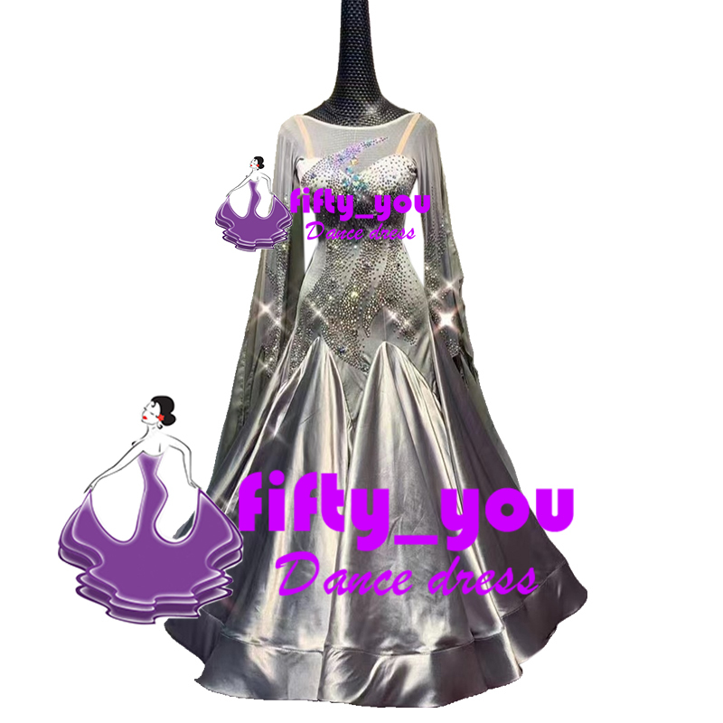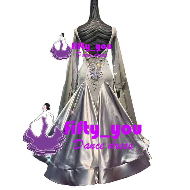 新品fifty_you  社交ダンス高級ドレス セミオーダー モダン競技パーティドレス スタンダードダンス衣装 ストーン飾り 薄いグレー