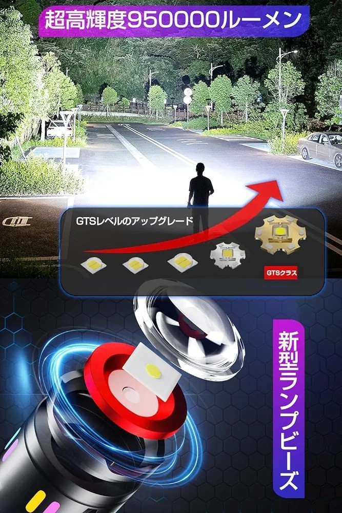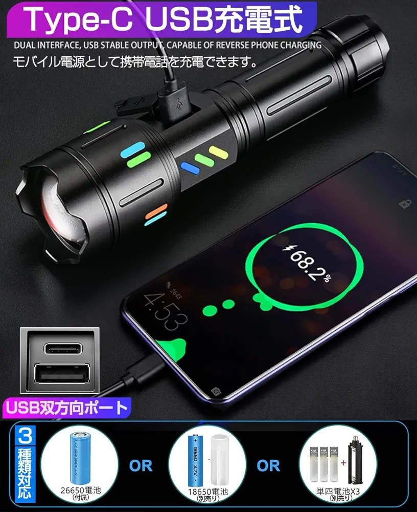 2023最新ディジタル電気量】懐中電灯 軍用 最強 超高輝度 950000ルーメン ペンライト Type-C USB充電式 ledライト 9000M 超長遠射 超強力 ハンディライト 明るい 5モード調光 ズーム調整可能 軽量小型 フラッシュライト ハンドライト 手持ち 作業用 携帯ライト 26650 18650 電池式 AAA電池が適用 防水 防災 新型 へっとライト 登山 夜釣り用 電力表示 ランタン キャンプ アウトドア 地震 停電対策 「大容量26650リチウム電池付き、Type Cケーブル、18650電池プラスチックチューブ×1、3 * AAA電池ホルダー×1、日本語マニュアル」