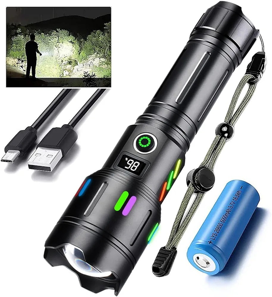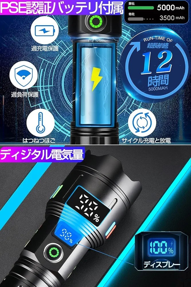 【ディジタル電気量& Type-C USB充電式 &過充電保護】デジタル化された電力量表示画面を革新的に使用し、00~100%の電力量表示を実現します。余剰電力量をより正確に知ることができます。懐中電灯はアップグレード版過充電保護を使用し、充電が完了すると懐中電灯の充電を停止します。懐中電灯が充電されていることを忘れても、安全問題を心配する必要はない。内蔵型Type C USB 3.0充電ポート、各種充電機器に対応しており、充電速度は通常usbより40%速い。付属26650型5000ミリアンペア大容量充電リチウム電池。超長時間の航続時間で、循環充電して使用することができます。