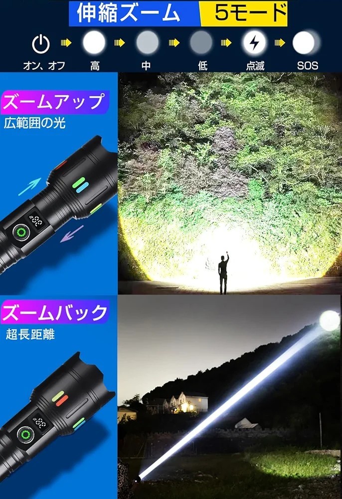 【5つの照明モード&3秒長く押すとじる&伸縮式フォーカス】任意のモードで3秒以上スイッチを長押しすると、急速に消灯することができます。消灯の切り替えを繰り返す手間を避ける。スイッチをタッチすると、高輝度-中輝度-弱輝度-点滅-SOS-消灯がすばやく切り替わります。5つの照明モードがあります。 最大9000メートルの強力な光線を投射でき、フラッドライトは道路を180度照らします。 大面積照明に適用です。 さまざまな目的に応じて、明るさモードと照明の焦点距離の範囲を調整できます。防災、キャンプ、登山、夜釣り、夜間照明、停電、地震対策、屋外ledライト、その他の照明および家庭での使用に広く使用されています。