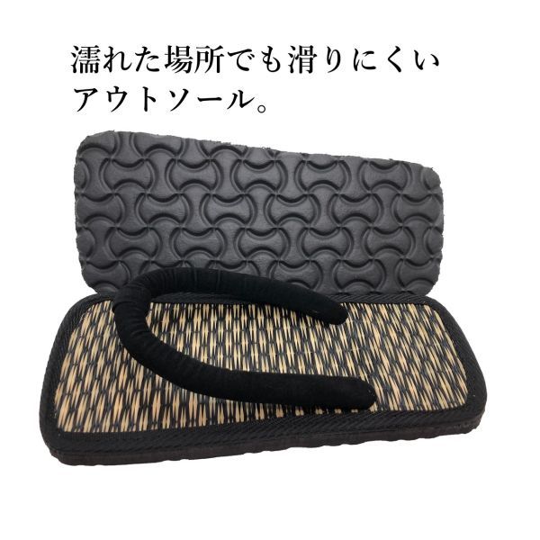 • 竹皮風素材の雪駄風サンダル。畳の上を素足で歩いているような心地いい肌触りです。草履を履いている様な濡れない涼しいサンダルです。親指と人差し指にしっかり挟まるトングタイプでウレタンゴム素材の底材は丈夫で軽量、長時間履いていても疲れません。