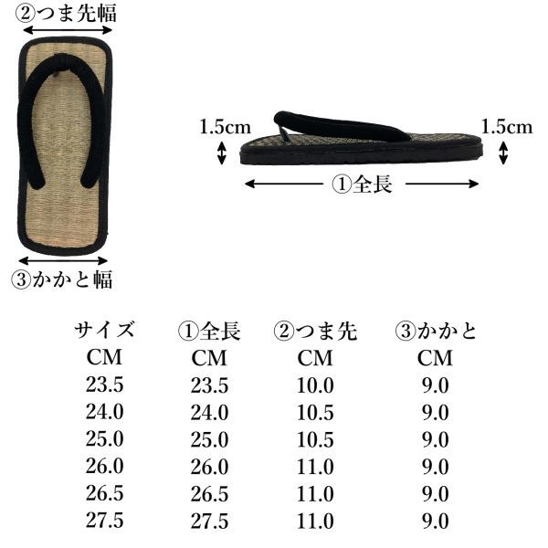 • 【ソール/つま先高さ】約1.5cm(フラット) 【主な素材】すげ皮、底材:ウレタンゴム 【重さ】両足約196g(26.5cmの場合)