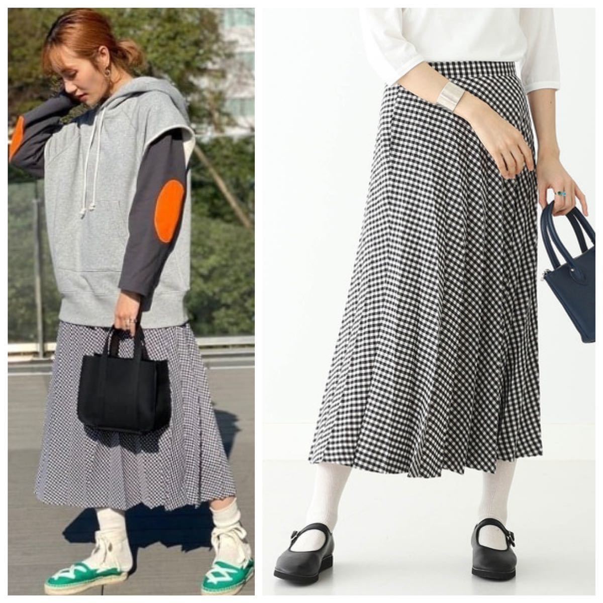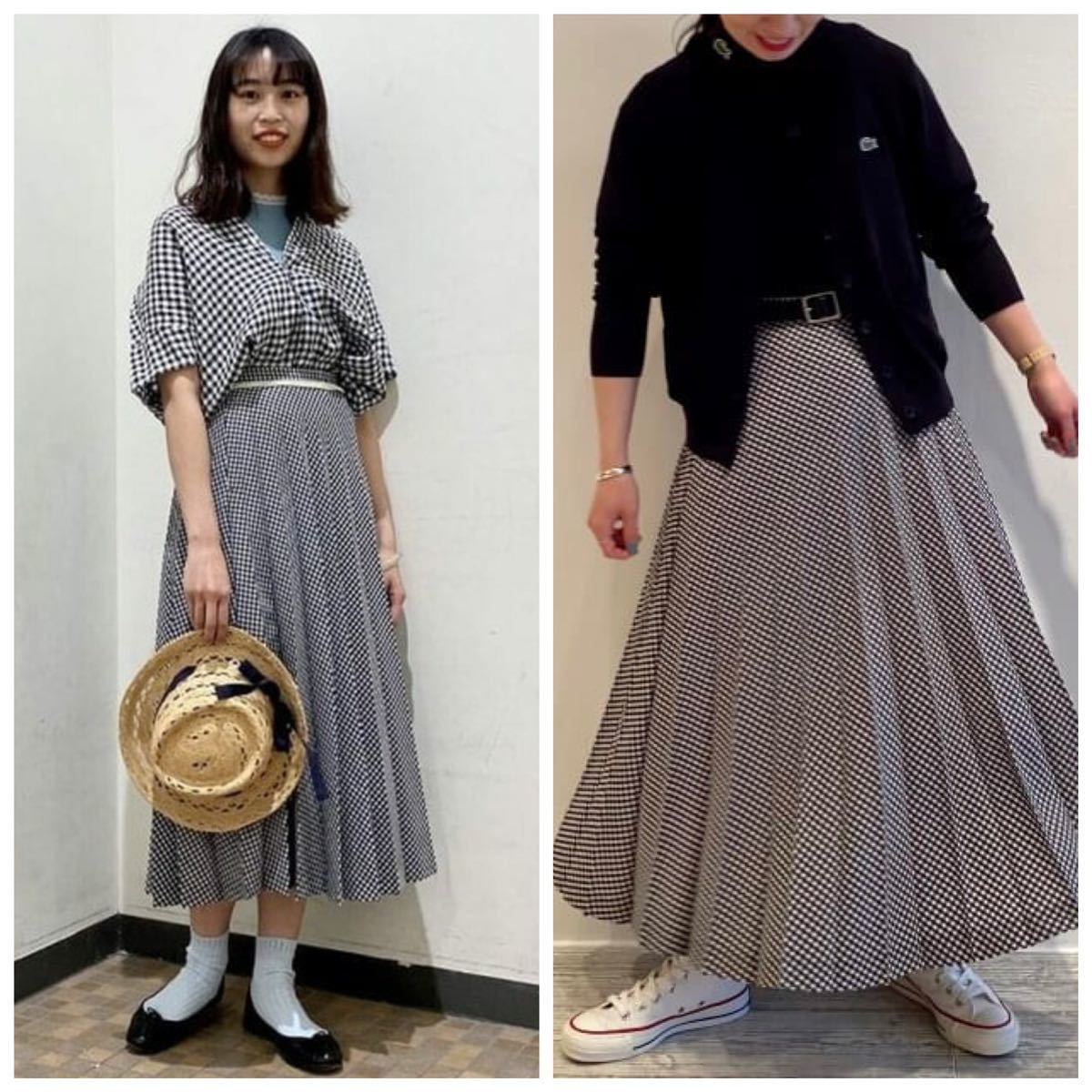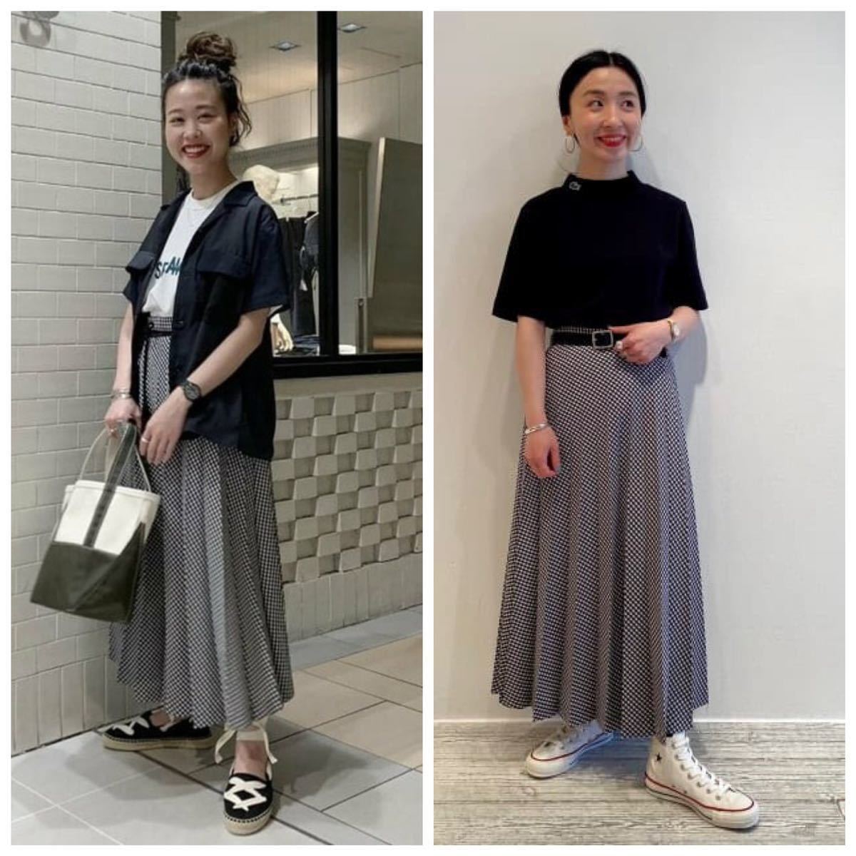 柄のスカートはシンプルにTシャツと合わせるだけでコーディネート映えするのでおすすめのアイテムです。