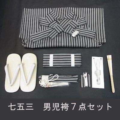 ▼三作▼新品即決 七五三 男の子袴セット  3歳~5歳用 黒色/グレーストライプ 縞はかま 7点セット ①