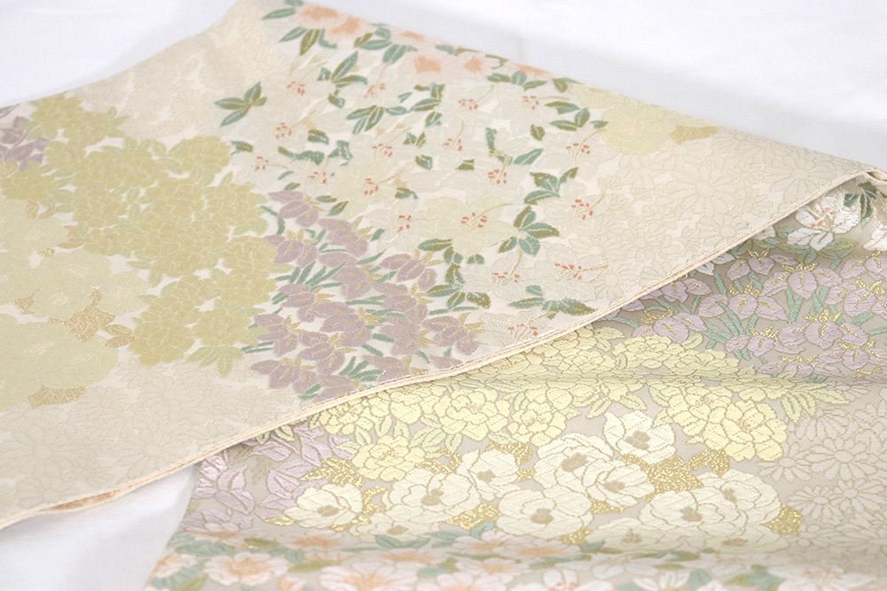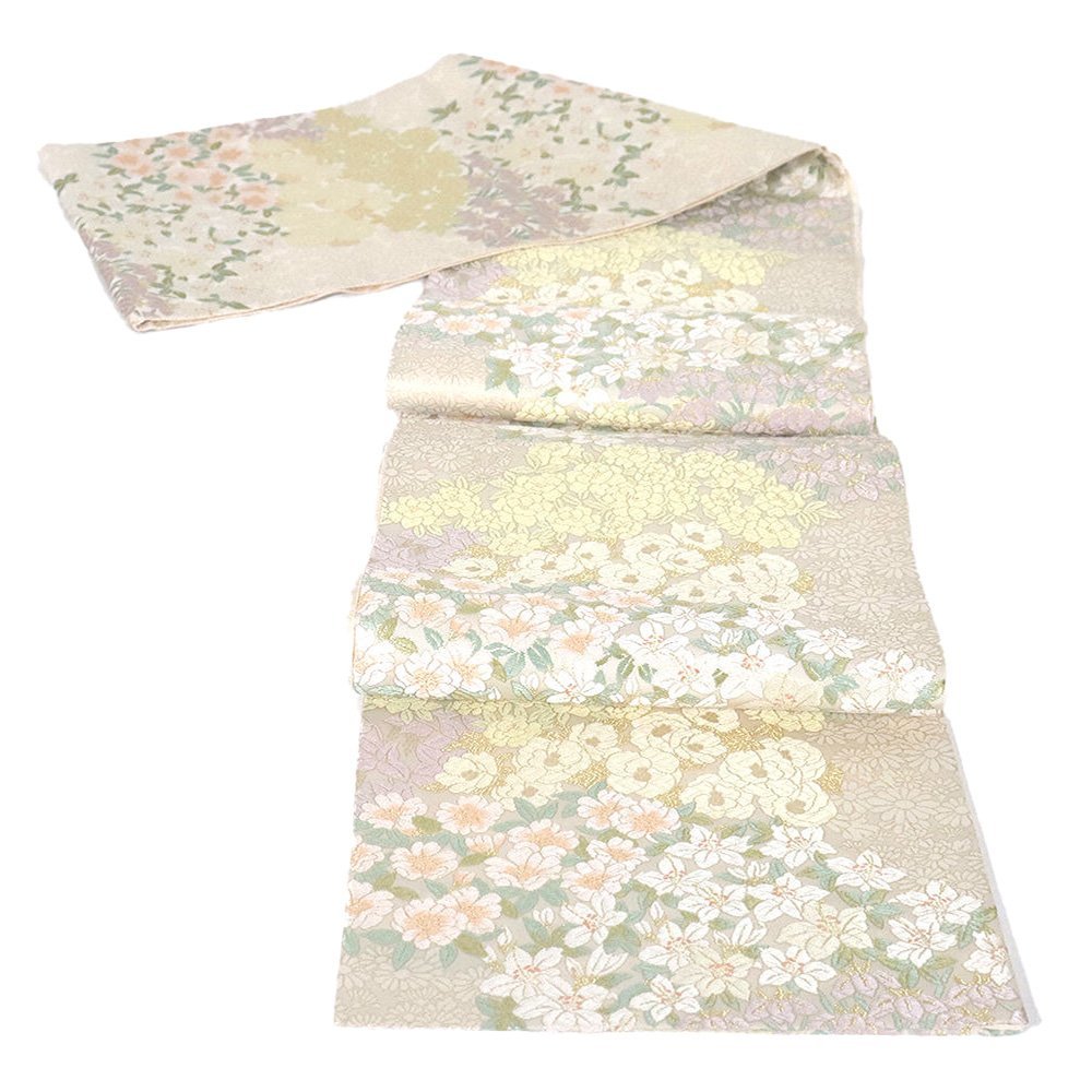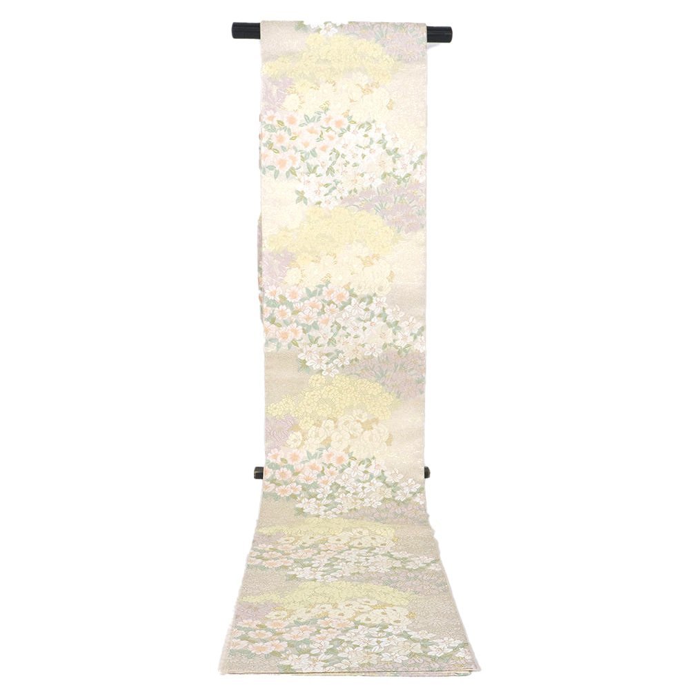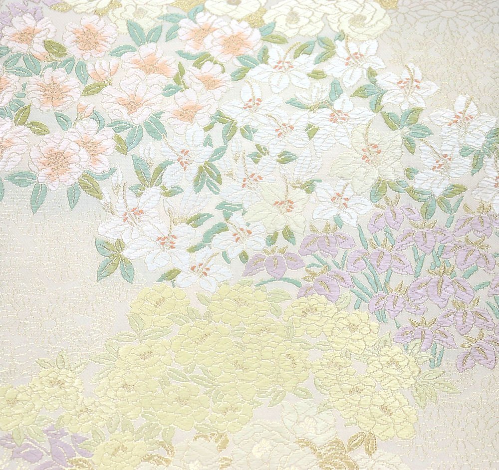 | 西陣織袋帯 唐織 御印 花文様 新小石丸 ベージュ・黄色・ピンク・金・白・紫地 唐織 本香茨・ゆうな・白樺・五葉躑躅・浜茄子・檜扇菖蒲 新品 仕立て上がり | |