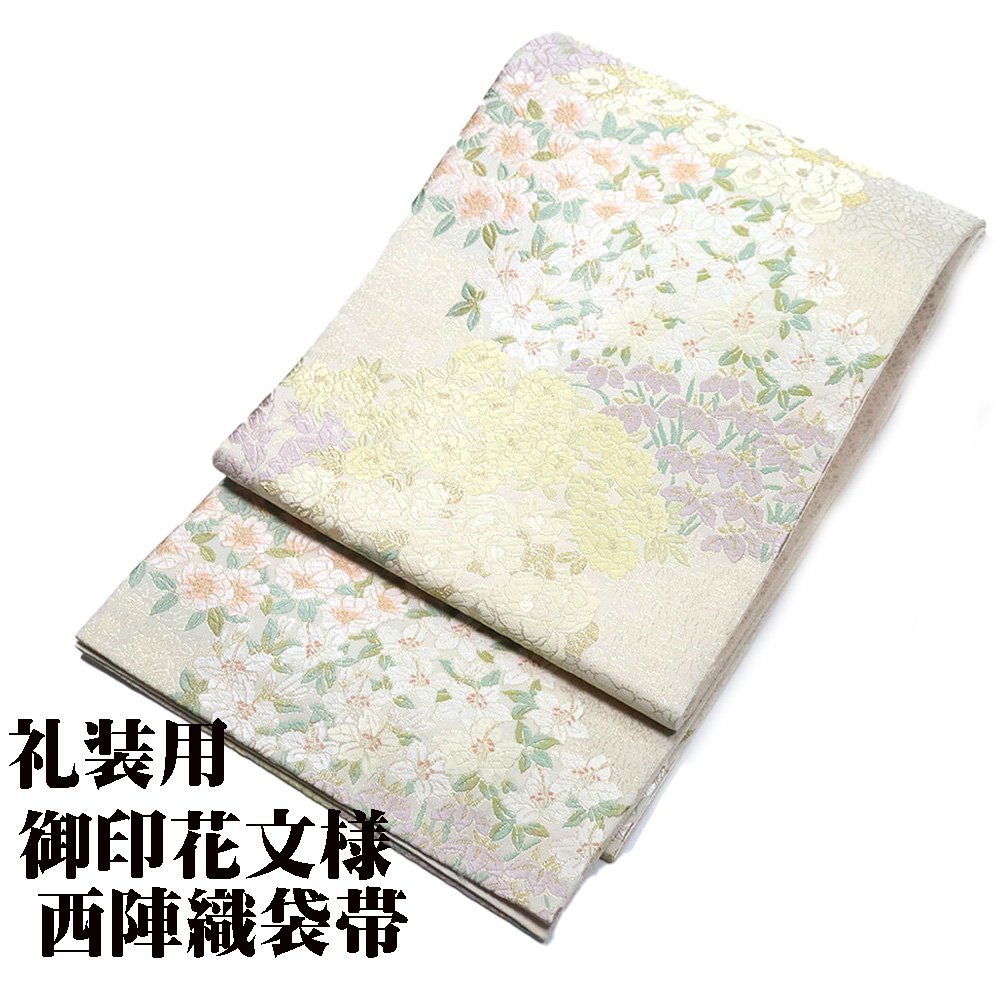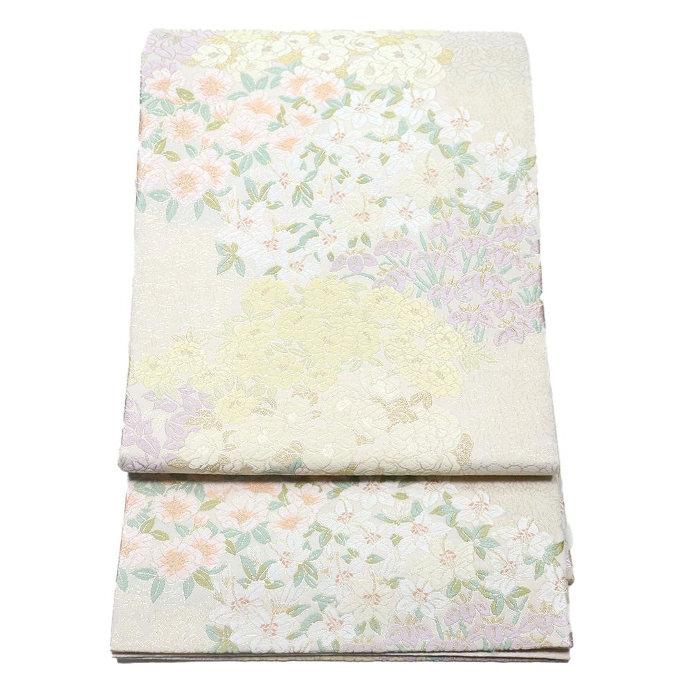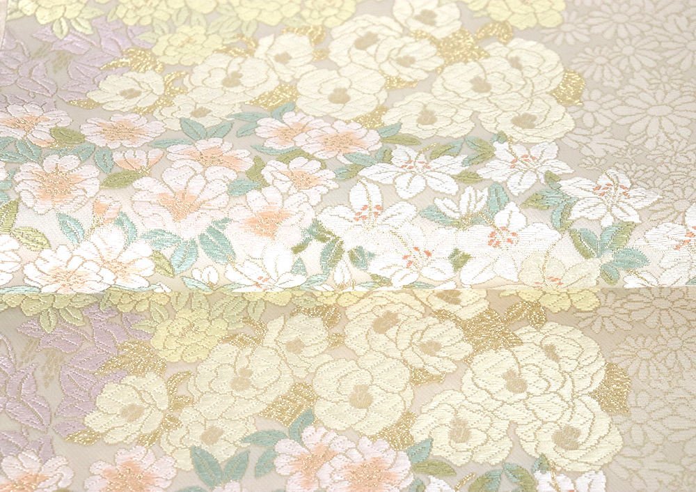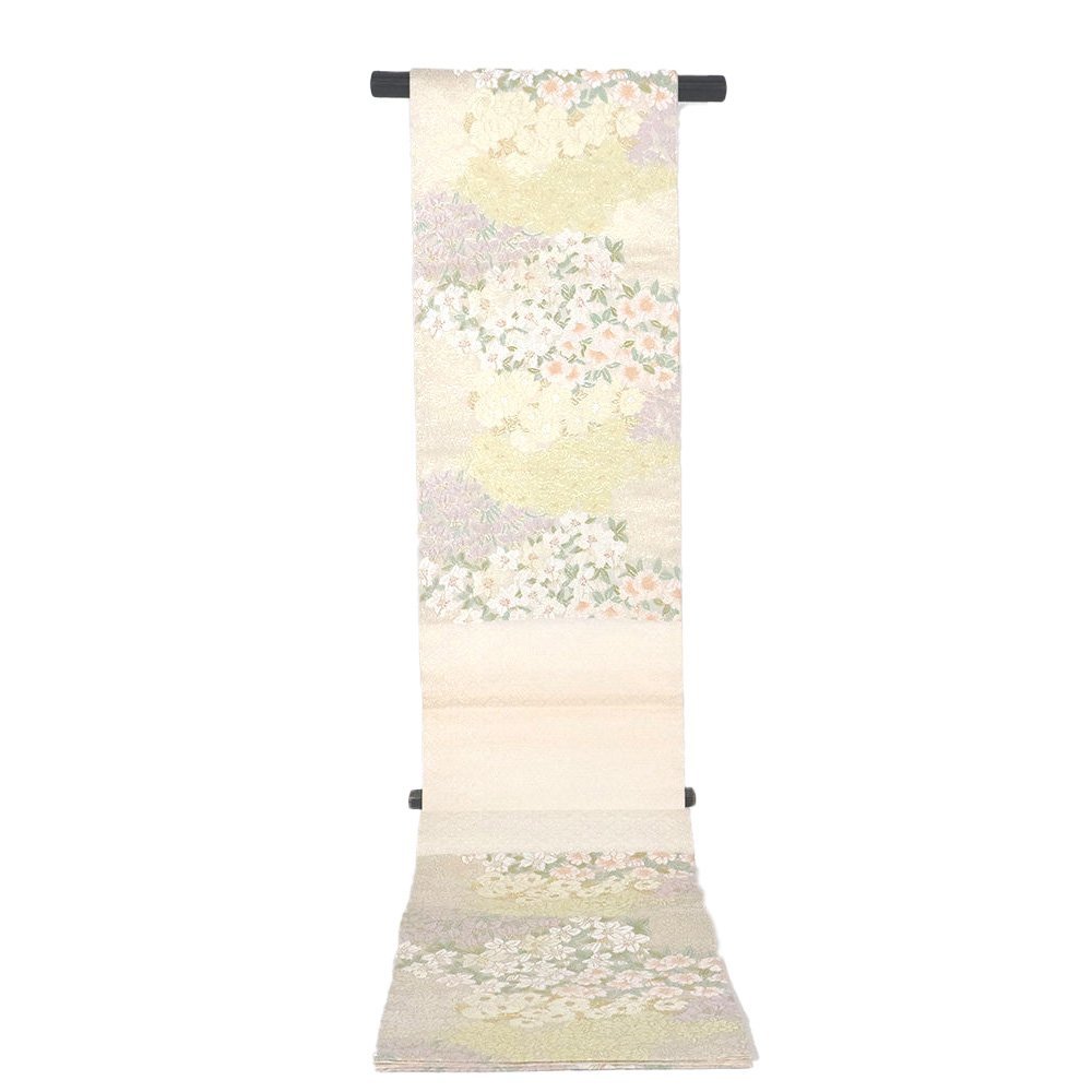 | 西陣織袋帯 唐織 御印 花文様 新小石丸 ベージュ・黄色・ピンク・金・白・紫地 唐織 本香茨・ゆうな・白樺・五葉躑躅・浜茄子・檜扇菖蒲 新品 仕立て上がり | |