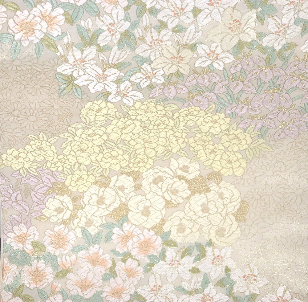 | 色・柄 | 西陣織袋帯 唐織 御印 花文様 新小石丸 ベージュ・黄色・ピンク・金・白・紫地 唐織 本香茨・ゆうな・白樺・五葉躑躅・浜茄子・檜扇菖蒲 (写真では上手く色が出ない場合があります。ご了承下さい) ※お使いのディスプレイの種類や設定の差により 実物の色と画像の色が少々異なることもございます。 写真の枚数が多いので一度パソコンでご覧ください。 |