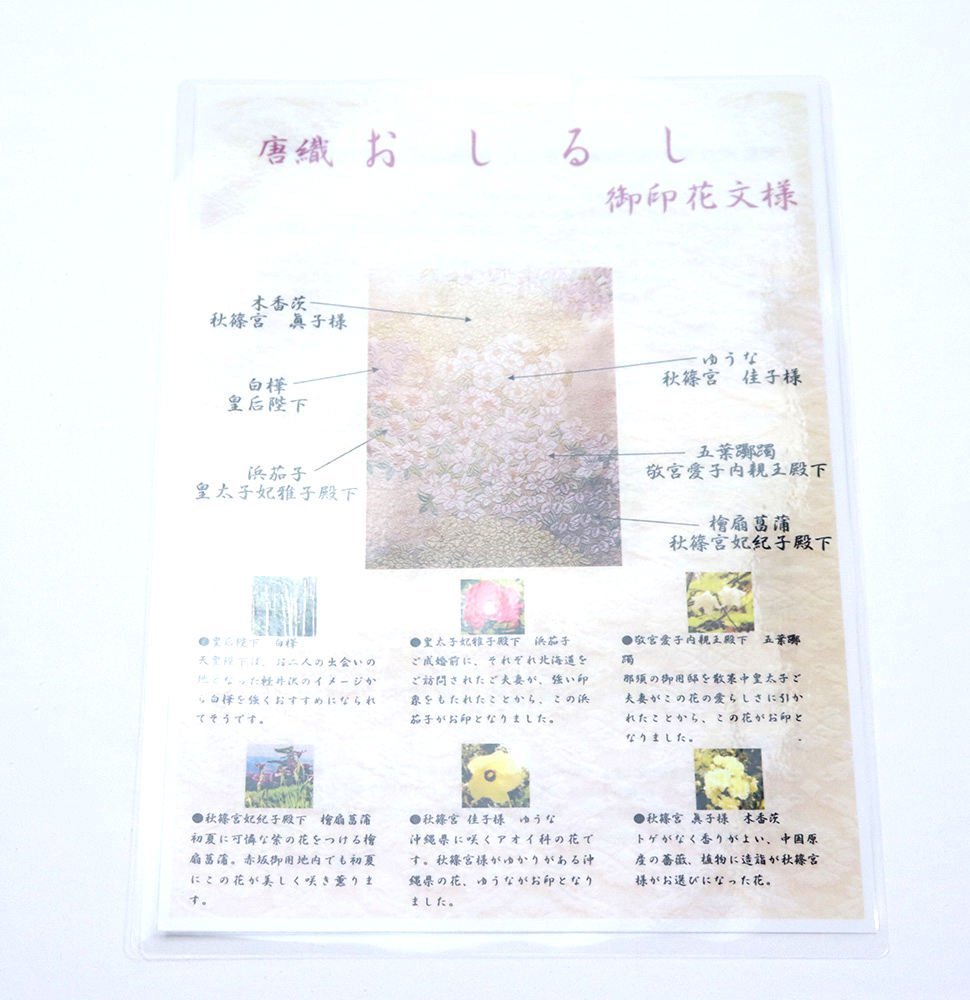 | コメント | 西陣認証ついていません。 カタログがついております。 皇后陛下:白樺 皇太子妃雅子殿下:浜茄子 敬宮愛子内親王殿下:五葉躑躅 秋篠宮妃紀子殿下:檜扇菖蒲 秋篠宮 佳子様:ゆうな 秋篠宮 眞子様:木香茨 付下げ・訪問着用にいかがですか。 新品。六通。 芯入り仕立て上がり品。 すっきりとした配色で現代の空間に映えるもの。 日本の古典文様をはじめ、長い歴史で培った高い技術に 今様の美しい意匠が光ります。 とても上品な帯です。 仕立て上がり。 上品な仕上がりになっています。 |
