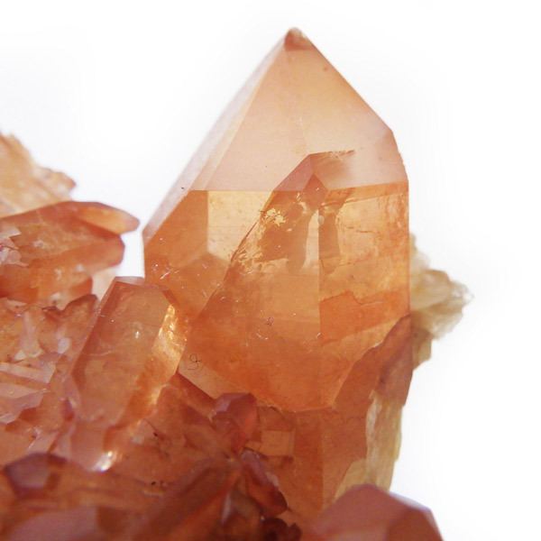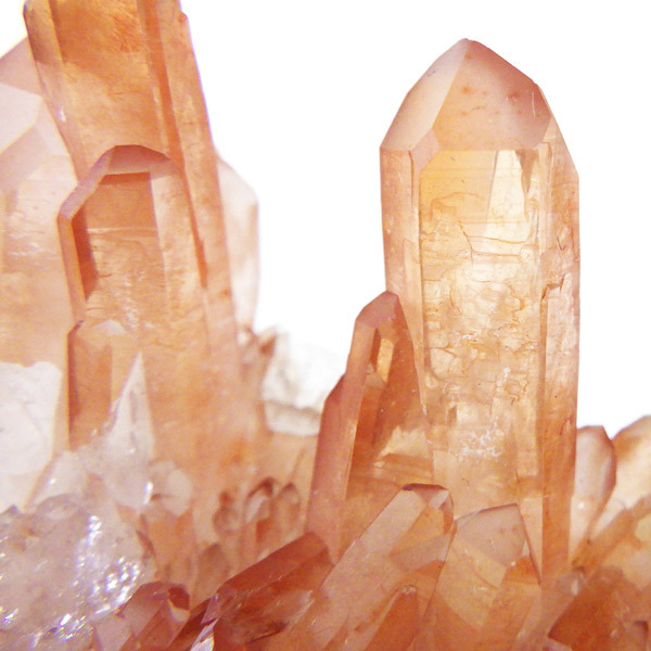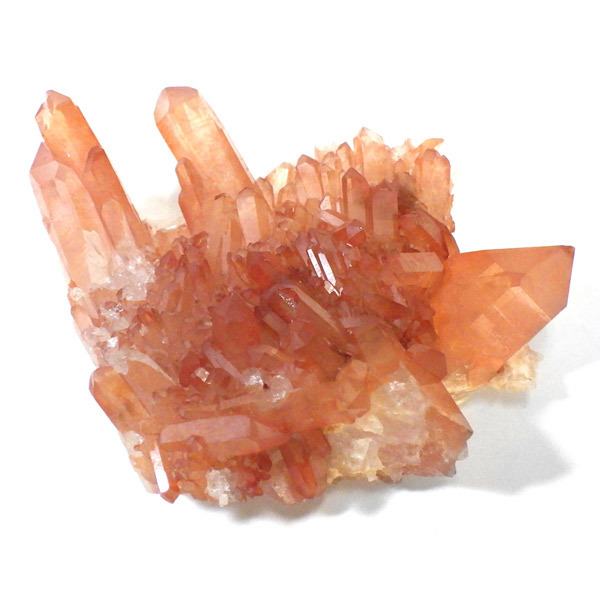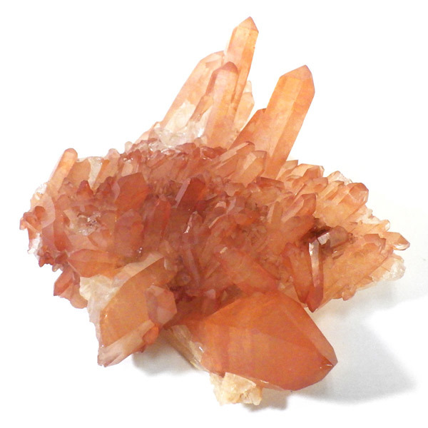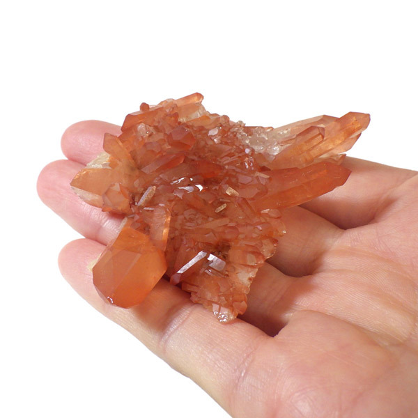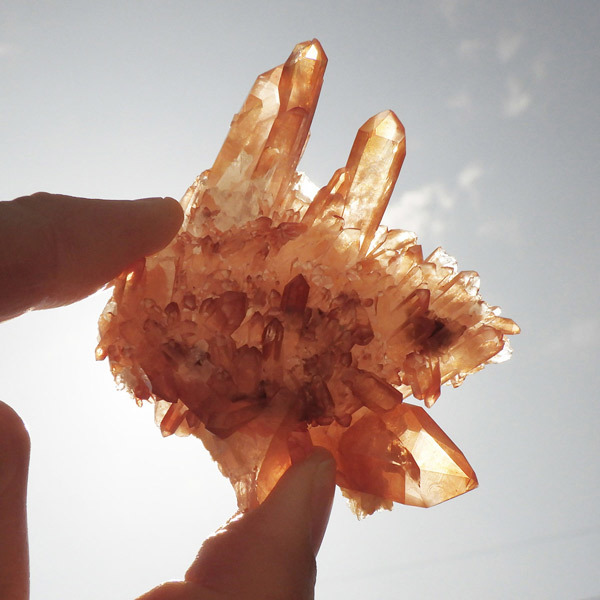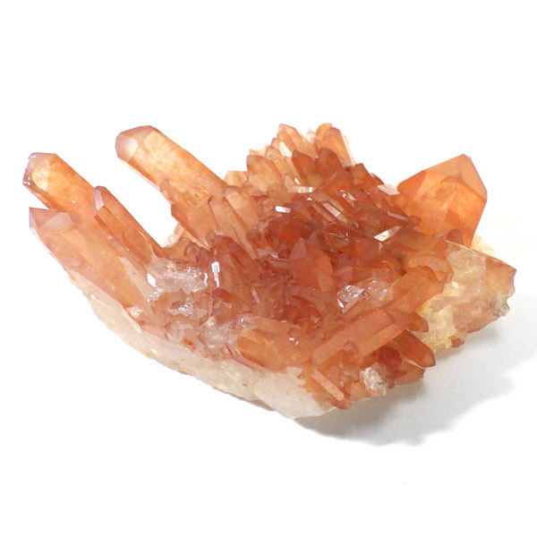 ブラジル産のタンジェリンクォーツ、クラスターです。オレンジ色に色づいた美しい水晶です。このオレンジ色は水晶の表面にヘマタイト成分が付着し、それが酸化してできます。表面は美しいオレンジ色ですが中身は透明な水晶です。