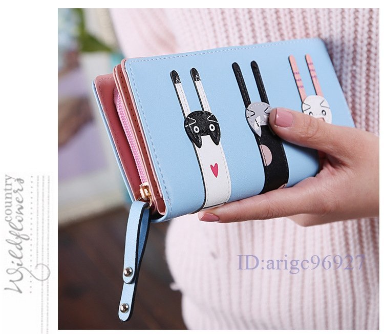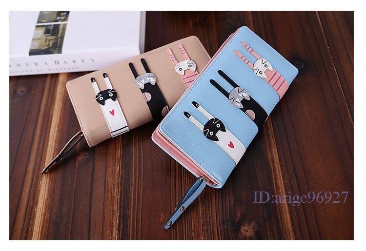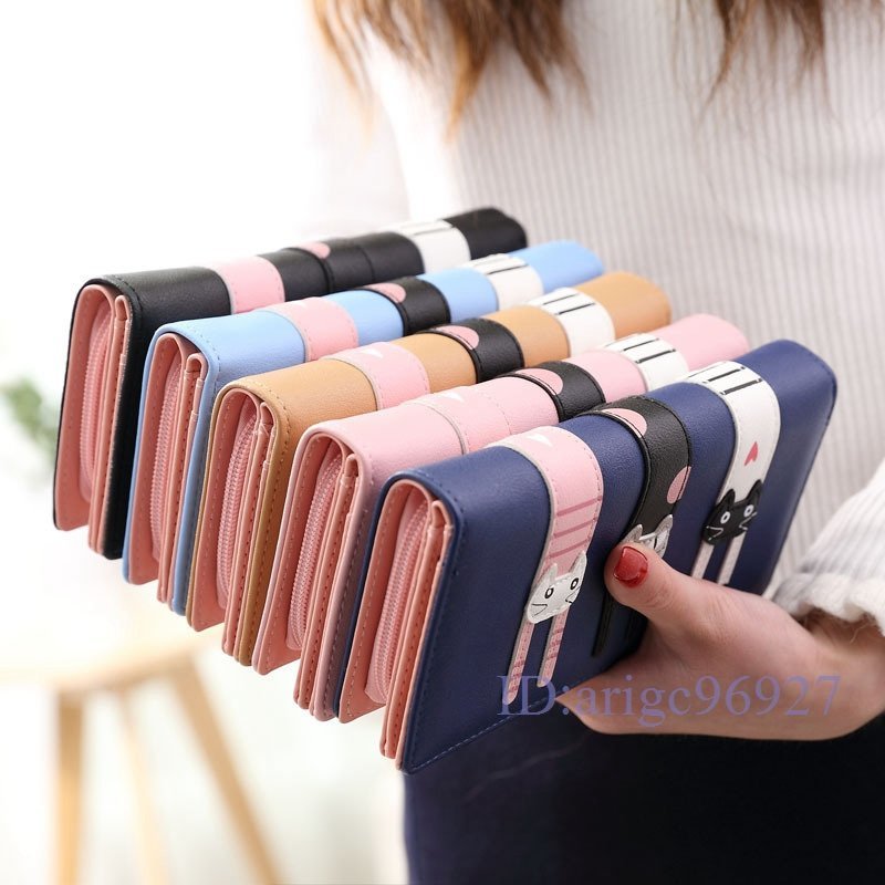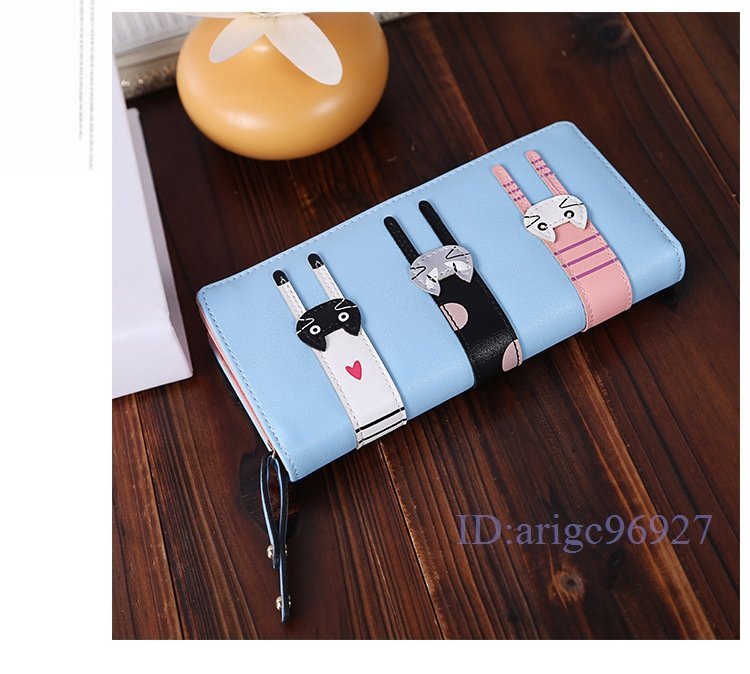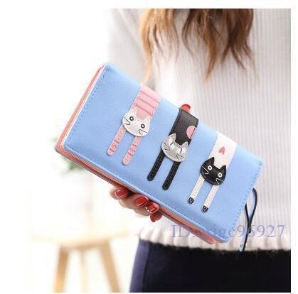 Y622☆新品大容量 レディース 長財布 クラッチバッグ 二つ折り カードがたくさん入る クラッチバッグ 可愛い 猫 PUレザー ブルー