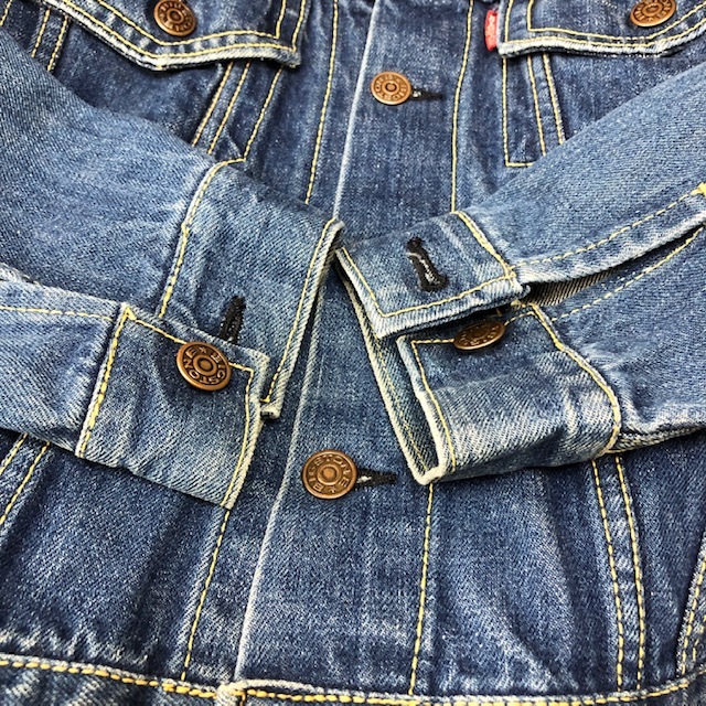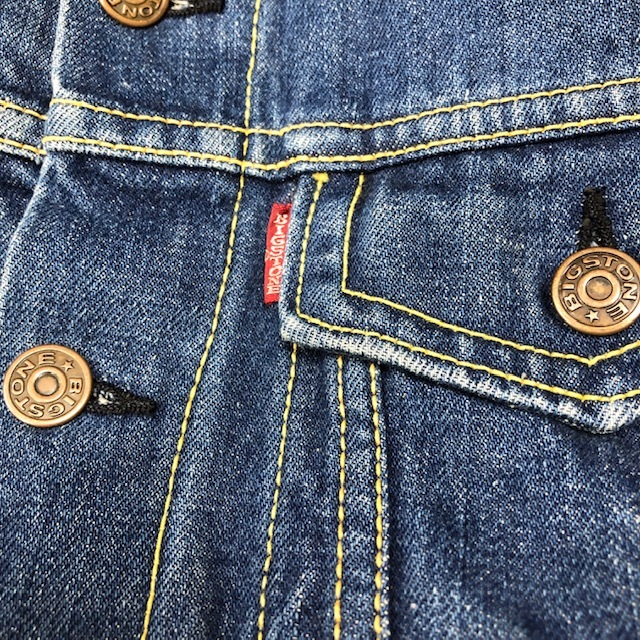 ●商品説明・・・70年代頃~の国産オールド・ヴィンテージのビッグストーンのデニムジャケットです。リーバイスのサードタイプの作りで、この頃はアメリカ製のデニムを輸入して、日本で生産されているので、USA物の同年代の物と同じような味わいのある綺麗な色落ちをするデニムジャケットです。しっかり濃いめのインディゴブルー色が残りつつもいい感じにアタリが出始めており、イエローステッチもいいアクセントになっていて、これから着こんでいただける一着です。タグが取れてしまっていますが、36(S)程度で、小柄なメンズやレディースの方向けなサイズ感かと思います。