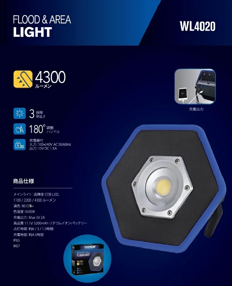 TAKENOW WL4020 充電式LED投光器/FLOOD & AREA LIGHT ACアダプタ付