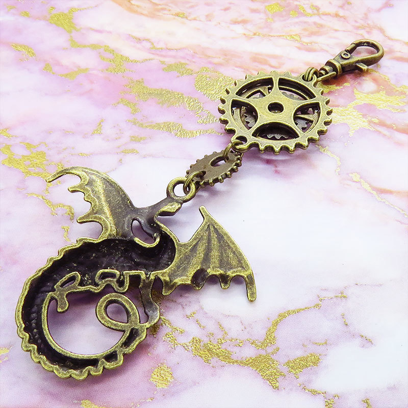 スチームパンク風アンティークカラーの歯車とドラゴンのキーホルダー チャーム バッグチャーム 金具変更可