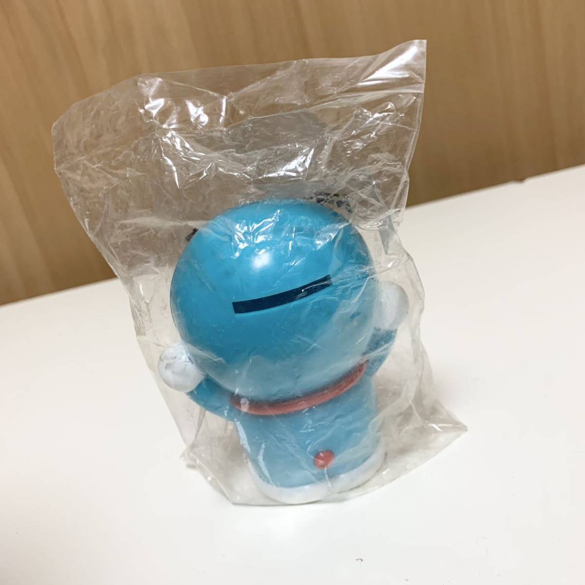 おそらくですが、郵便局かゆうちょ銀行とのコラボと思われる、ドラえもんのプラスチック製貯金箱です。