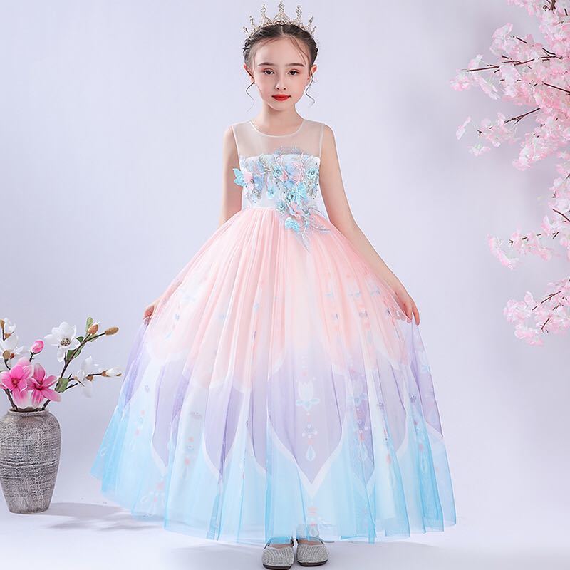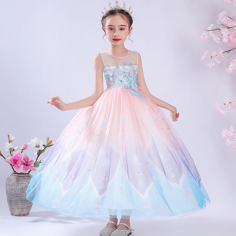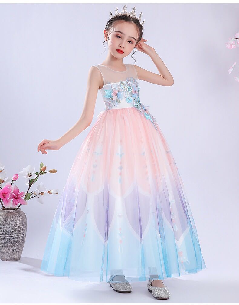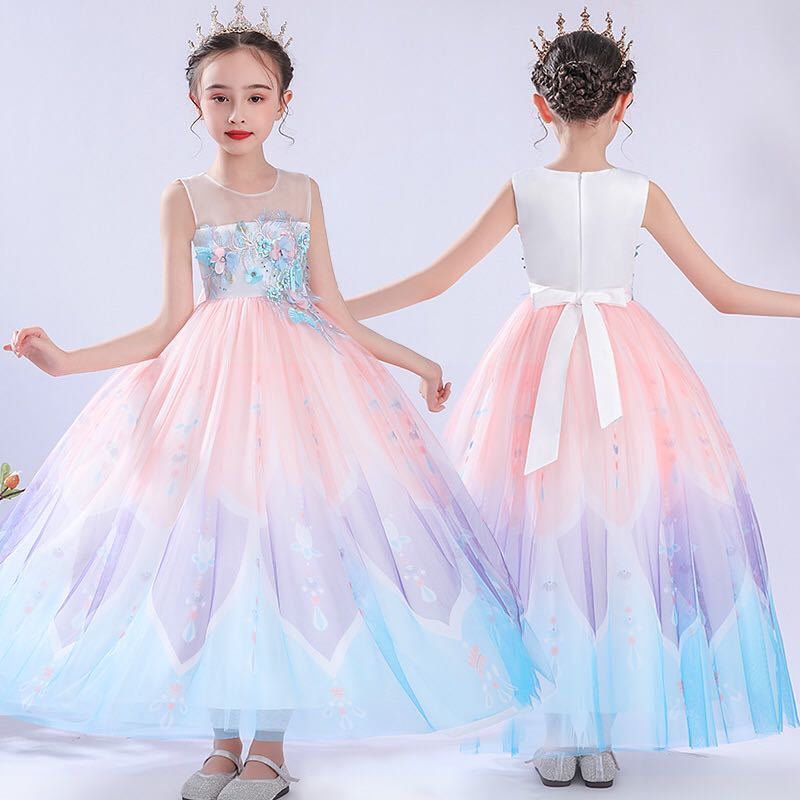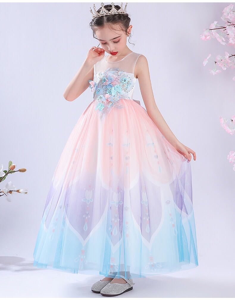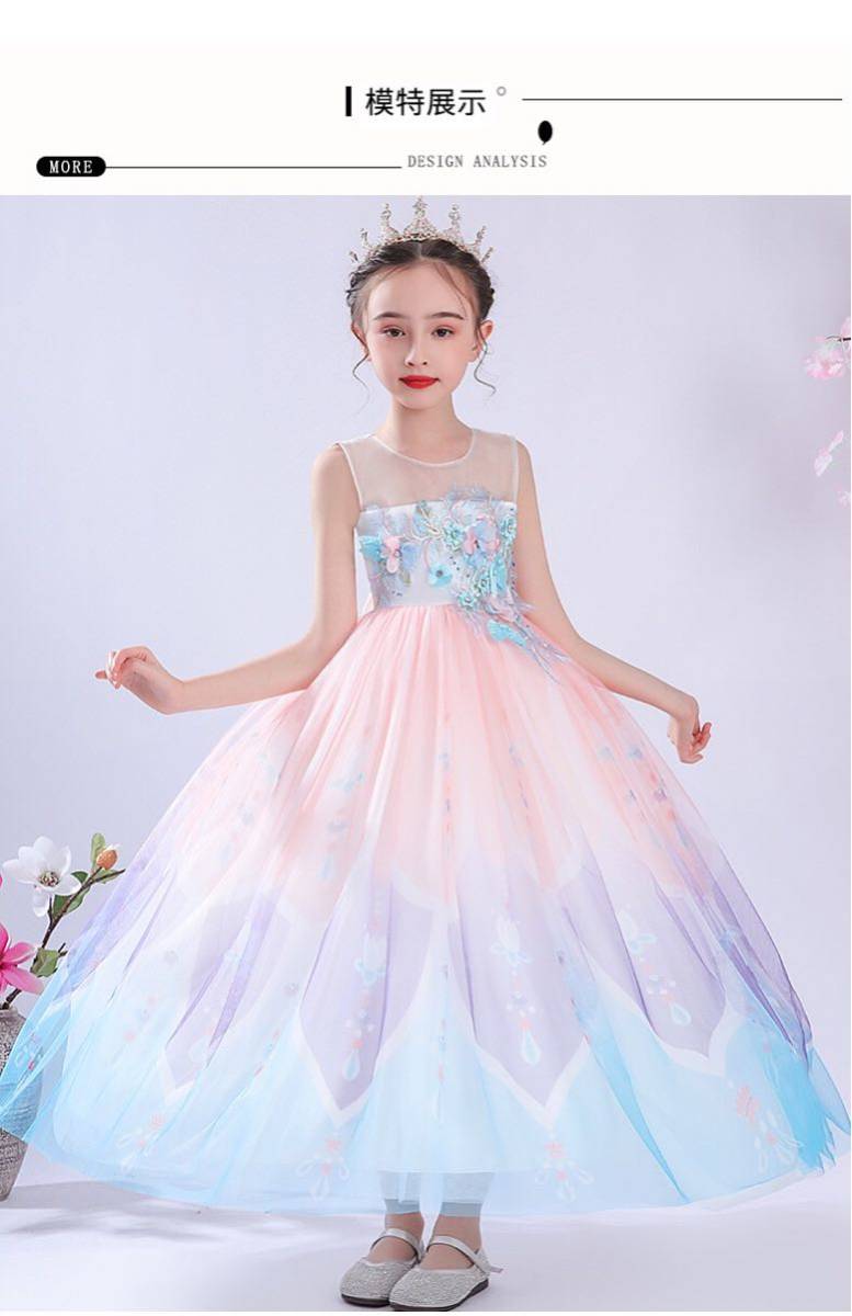 珍しいピンク、パープル水色3色で合わせたキッズフォーマルドレスです。ロングドレスの丈になります。刺繍で、ふんわりでこれからもう大活躍なドレスになりあ。
