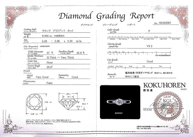 石 | ダイヤモンド 0.504ct カラー : F クラルティ : VS2 カット : Good ルースサイズ 5.03-5.06x3.20mm | |