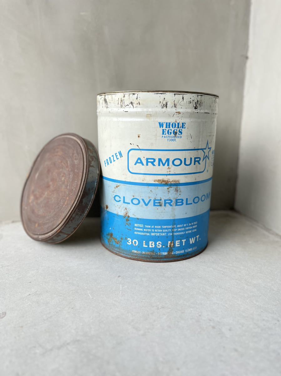 1940年代よりアメリカ、シカゴでチーズなど卵製品を販売していた、アーマー&カンパニー、クローバーブルームの大きなティン缶です。