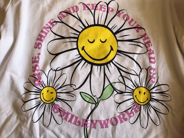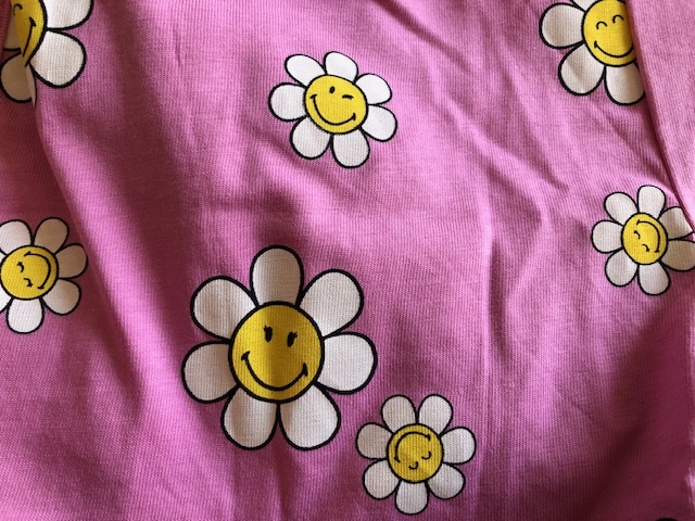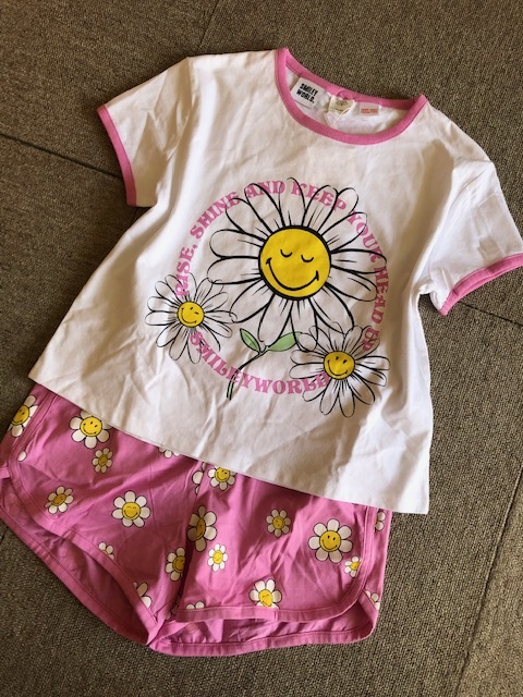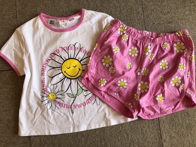 スマイルフラワーの可愛い柄がポイントの、半袖T&ショートパンツのパジャマセットです。 お色はオフホワイトとピンクです。