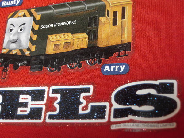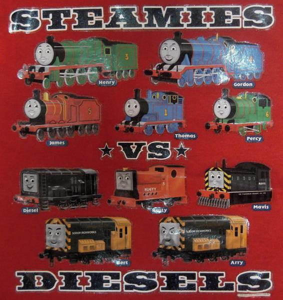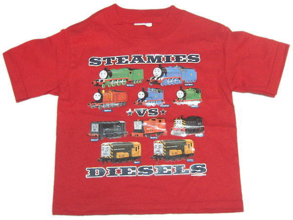 | THOMAS THE TANK ENGINE, HT STEAMERS VS DIESELS TODDLER TEE イギリスで1984年にテレビシリーズとしてスタートした「きかんしゃトーマス」のキッズTシャツ「HT STEAMERS VS DIESELS TODDLER TEE 」です。 蒸気機関車の主要キャラクター達、ヘンリーやゴードン、パーシーらと、ライバルのディーゼル機関車たちの競演! グリッターの転写プリントになります。 キュート! 新品・USA正規品 2歳用ボディー 1.5~3歳児位迄によいかと思われます。肩幅28cm、着丈36cm、身幅29cm メール便送料¥250です。 キャラクターアイテム、TOY、カンパニーTシャツ等ライセンスアイテム、ラットフィンク関連品、バンドTシャツ等取り扱っております。 ** 他にも色々出品中です。 CWtoy iwkd IWts | |||||||