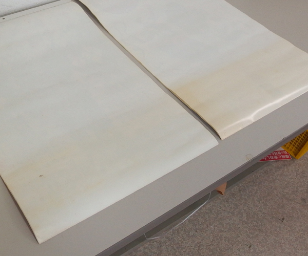 こちらは丸めて未使用で保管していたお品ですが、袋にはイロヤケやヨゴレがあり