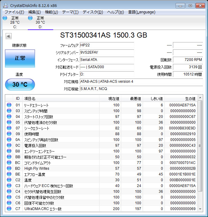 どちらにも不良セクタの表示は何もありません。動作は問題なく、良品と思います(^o^)