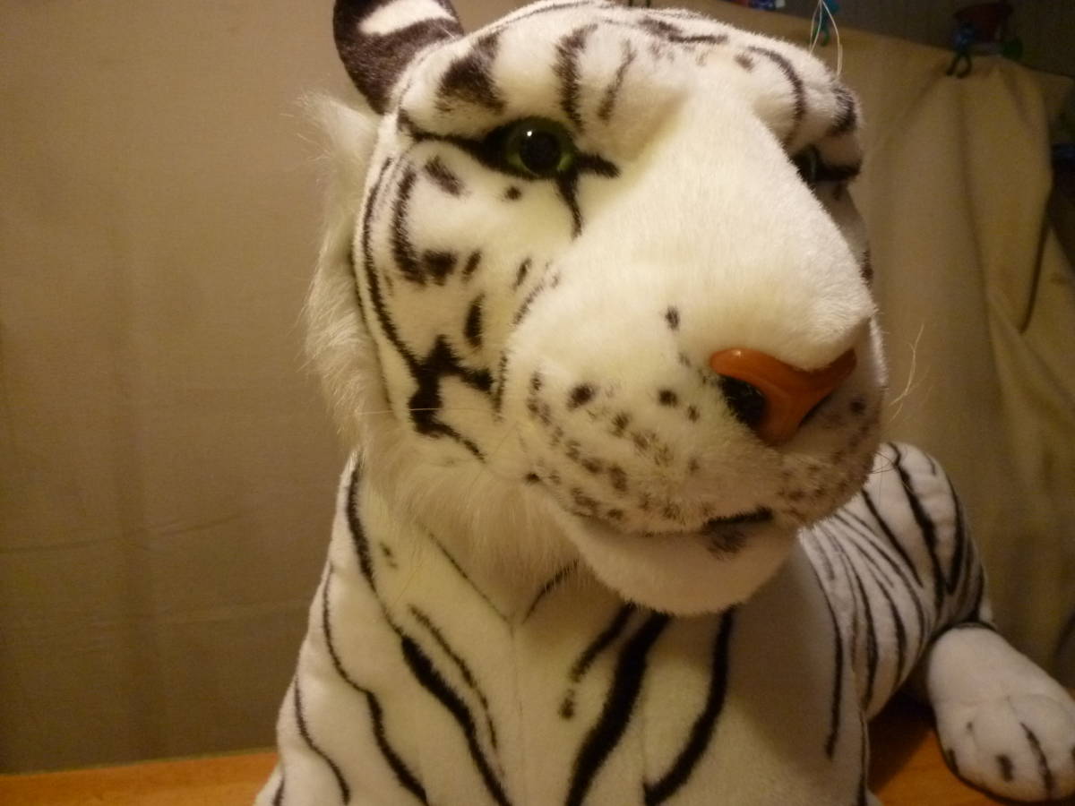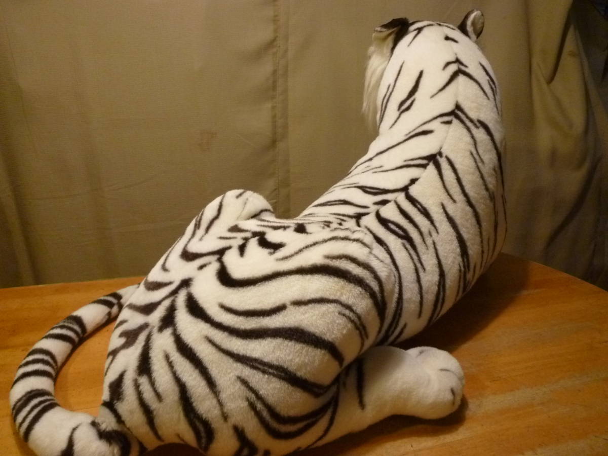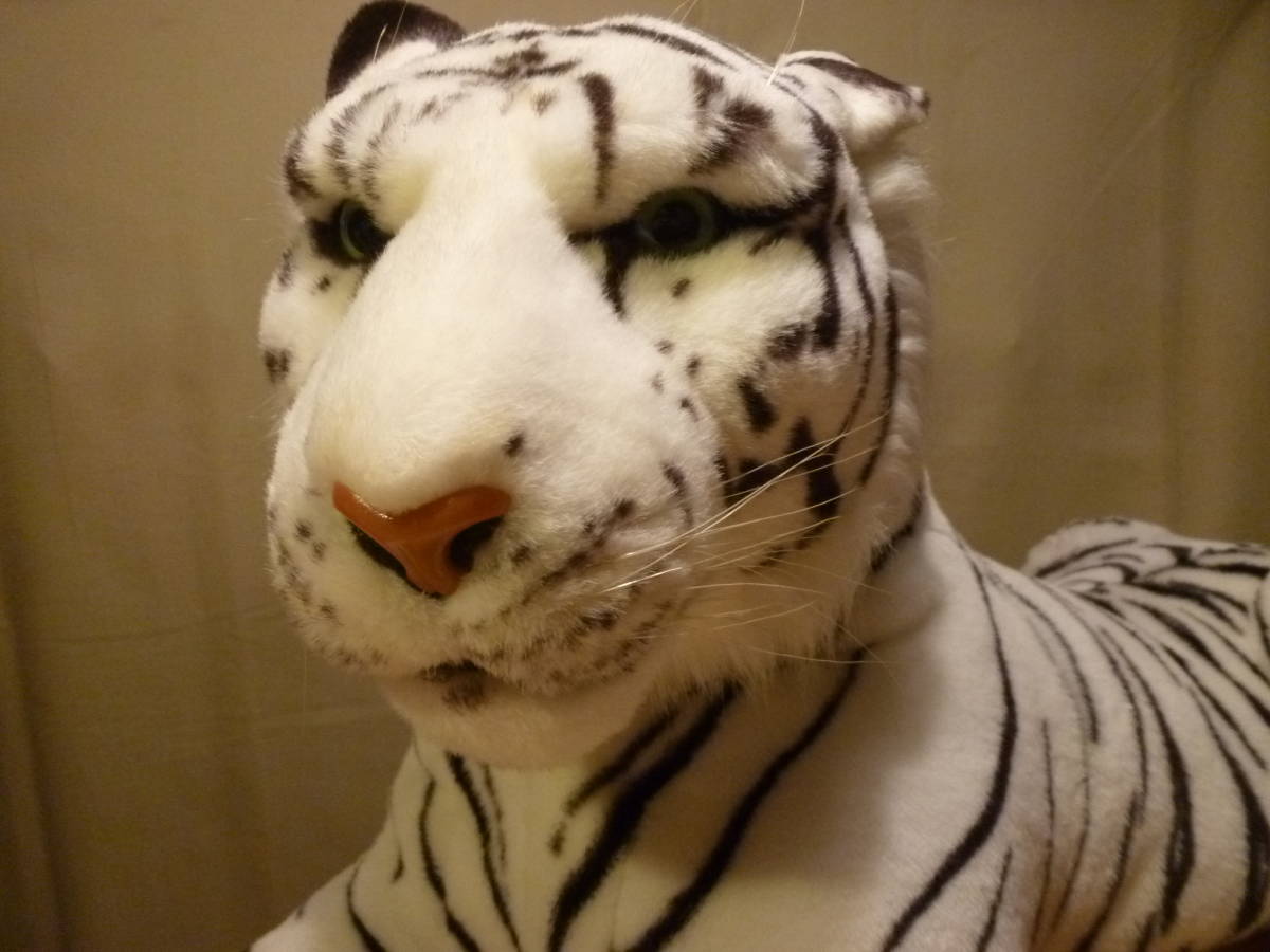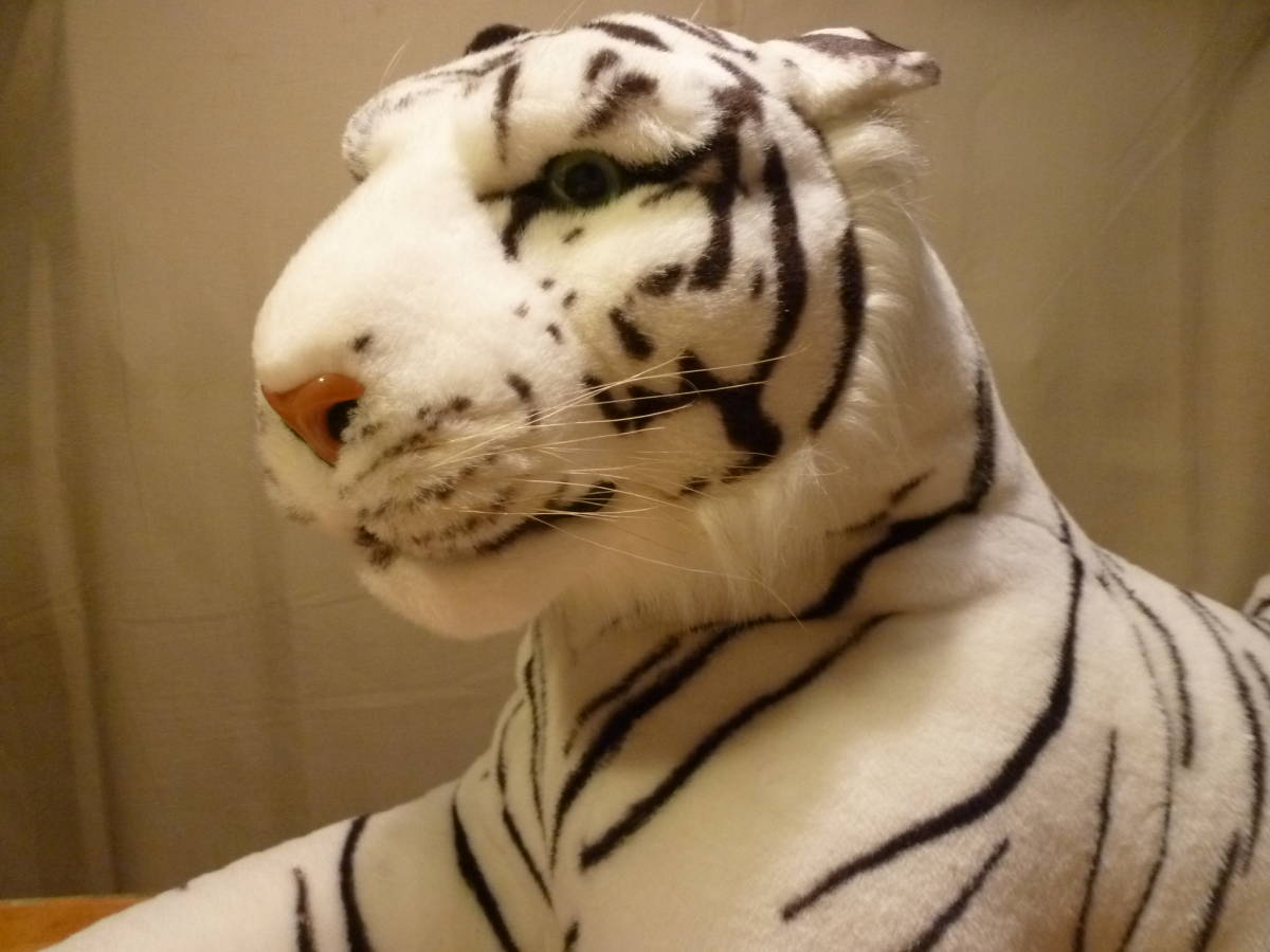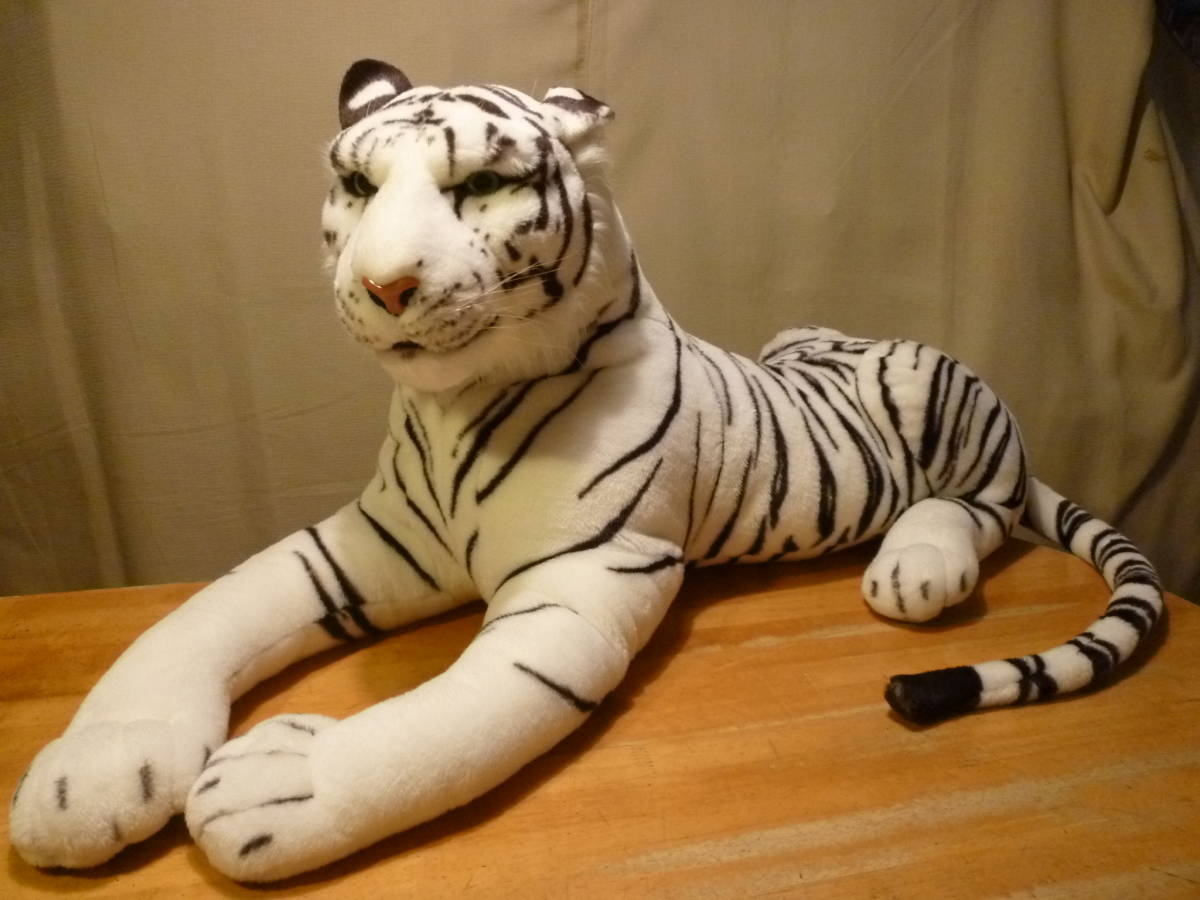 こちらは大きなホワイトタイガーの腹ばいポーズのぬいぐるみで、前方の腕先から尻尾の先まで伸ばすと約165cm位になり、耳を少し寝かせキリッと前方をにらみ、湿感のある鼻先が特徴的です。