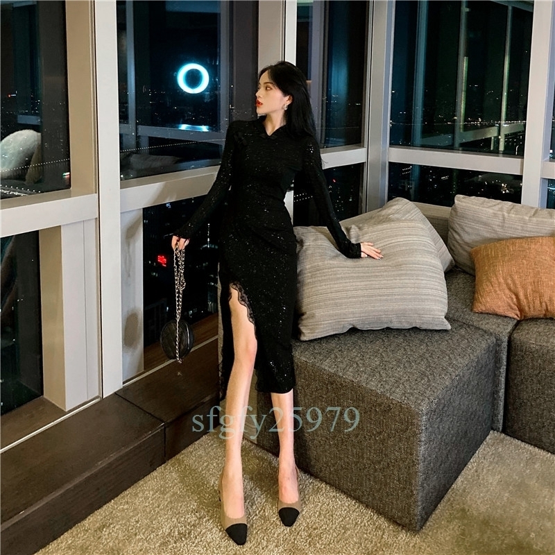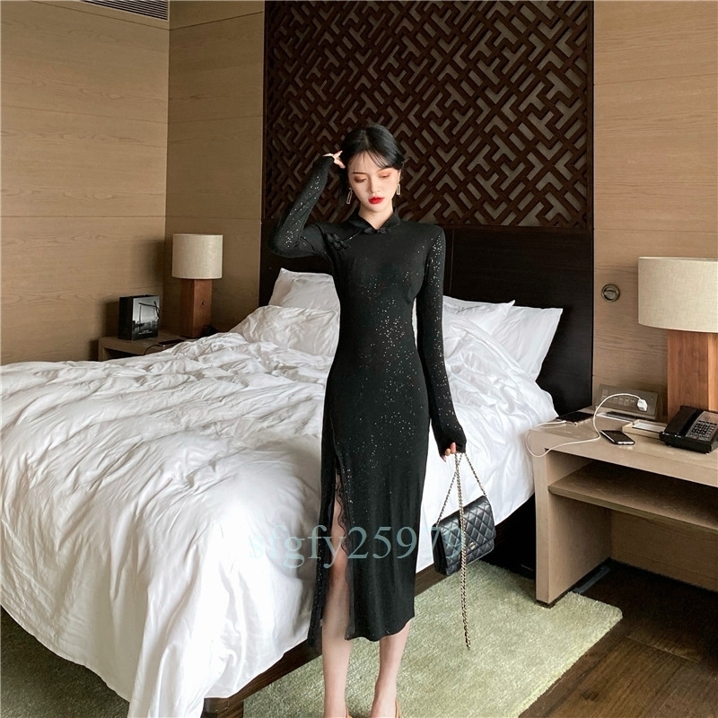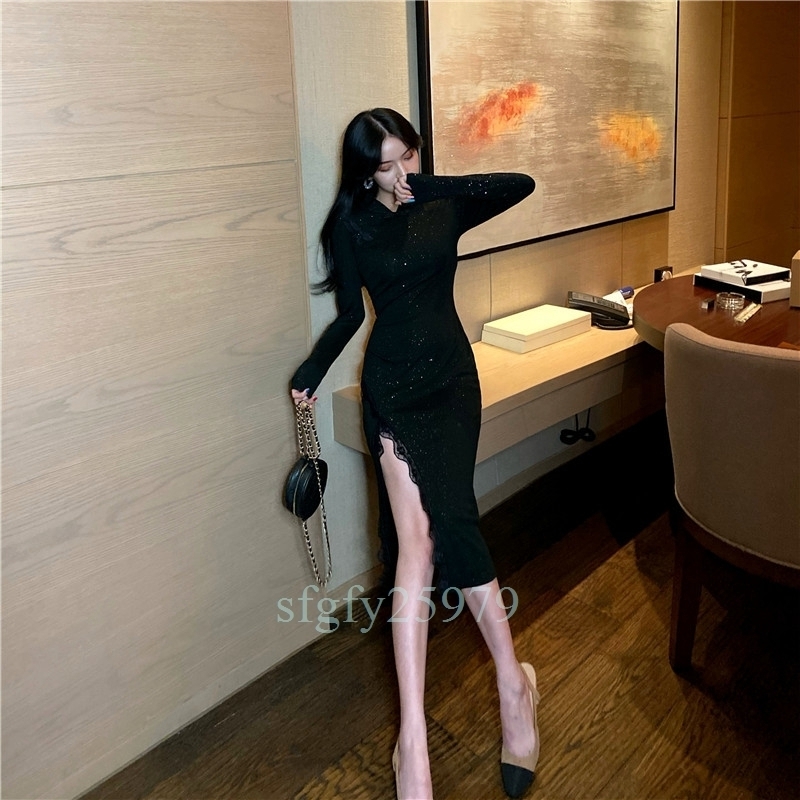 B806☆秋新作?エレガント?スリット入り?レディース?レース付き?ストレッチ?チャイナドレス風?長袖タイトワンピース?S~L