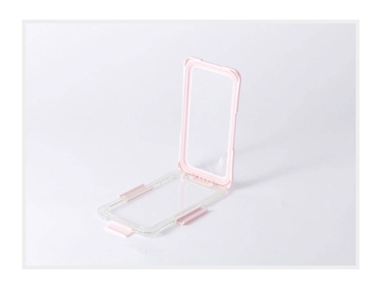 iPhone11までのサイズに対応。縦にも横にも立てて見られるスタンド付き。