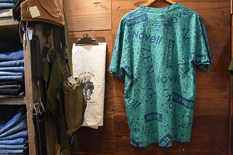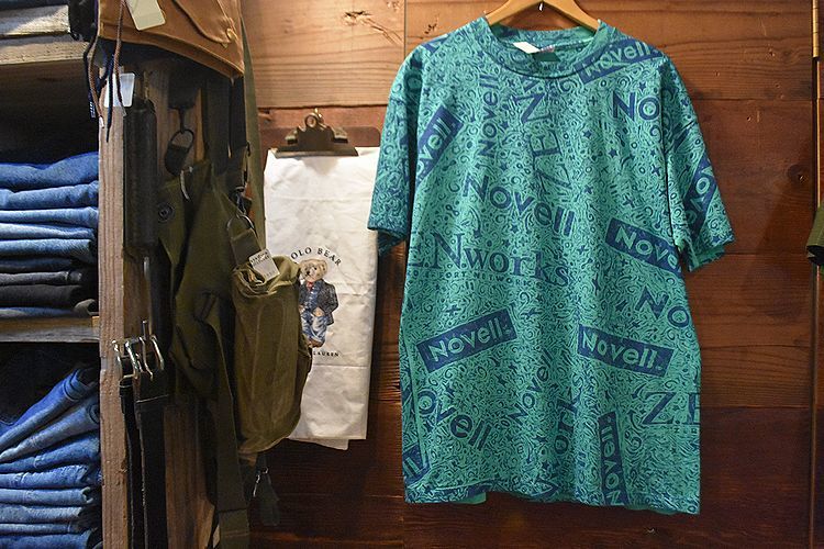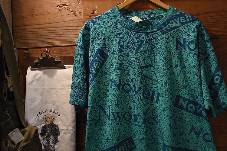 グッドカラーUSA製90Sビンテージanvilアンビルボディ総柄プリントTシャツ2Xエメラルドグリーン系Novell企業物ロゴアメカジストリートnt5945