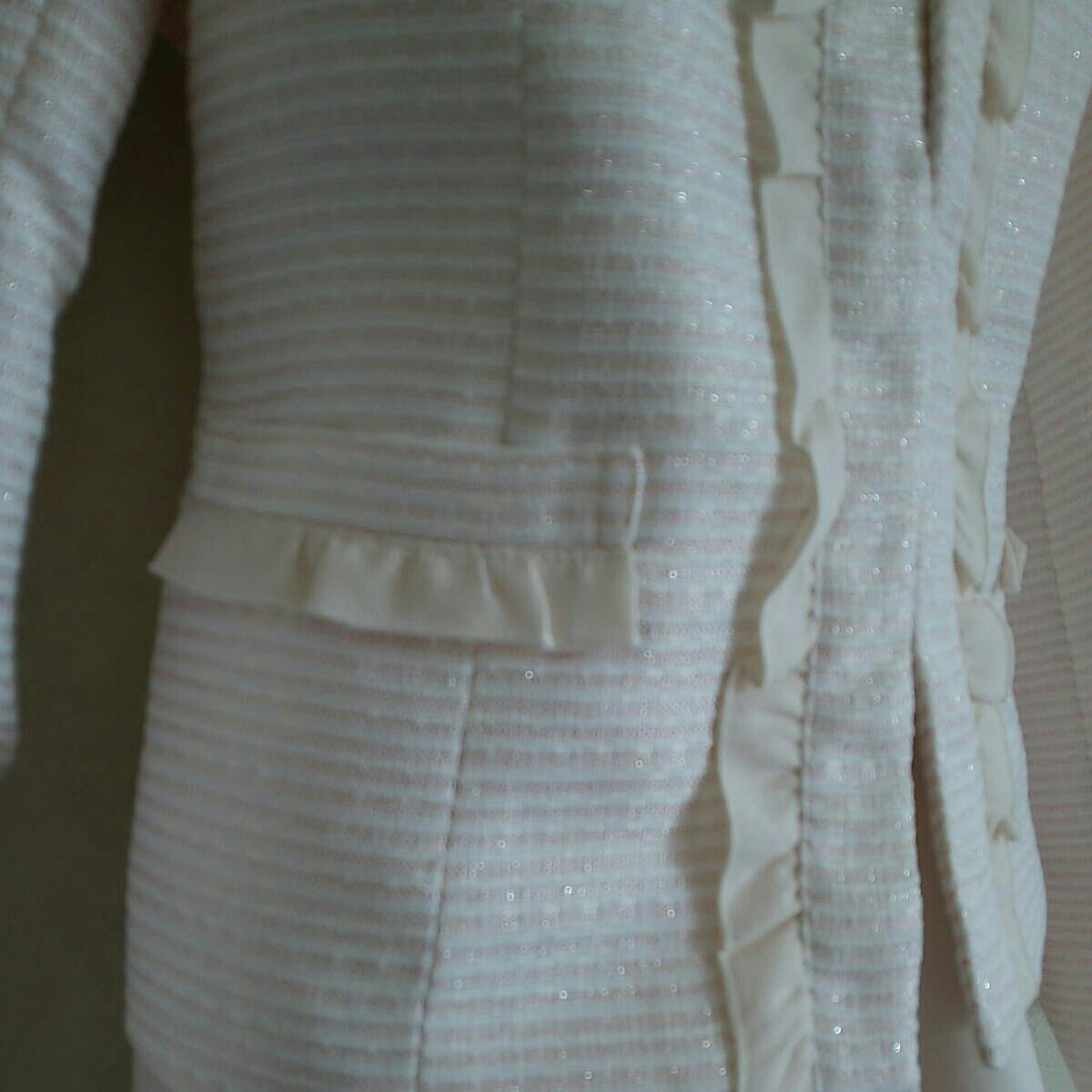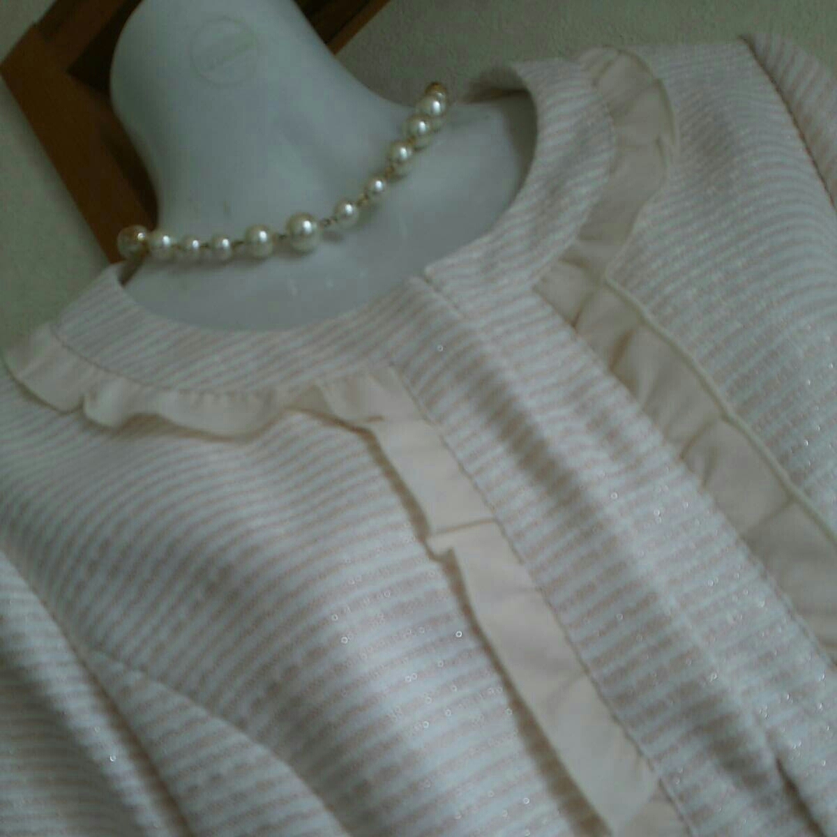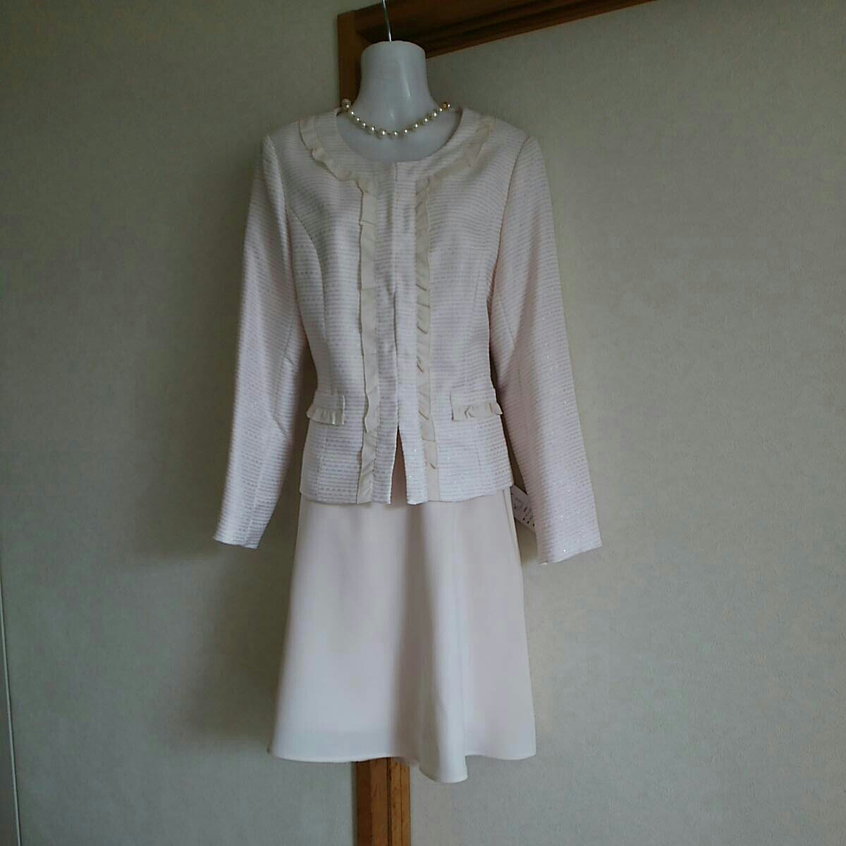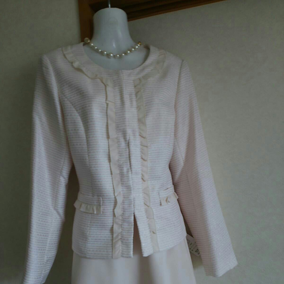 ノーカラースーツ2点セットになります。ラメ感があり高級感があり素敵なスーツです。キャミを着て前を開けて着ていただけます。色はピンクです。サイズは15号です。バスト92、ヒップ101、ウエスト76、スカート丈62センチです。入学式・結婚式・オフィスでも幅広く活躍できると思います。