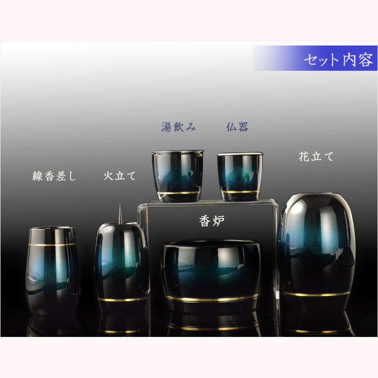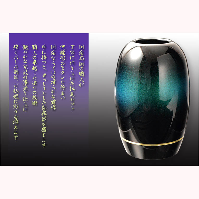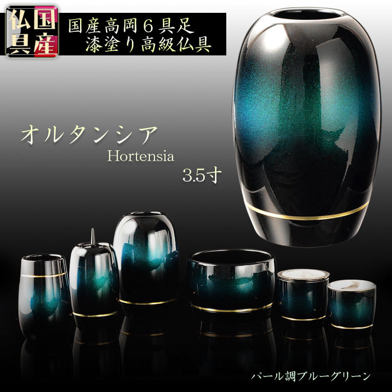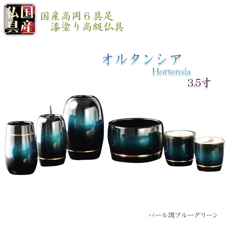 国産仏具【高岡仏具 漆塗りモダン6具足セット:オルタンシア パール調ブルーグリーン 3.5寸】送料無料