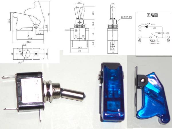 誤操作防止スイッチ ミサイルスイッチ 青色LED付 安全装置カバー付きスイッチ 青色カバー トグルスイッチ スイッチ