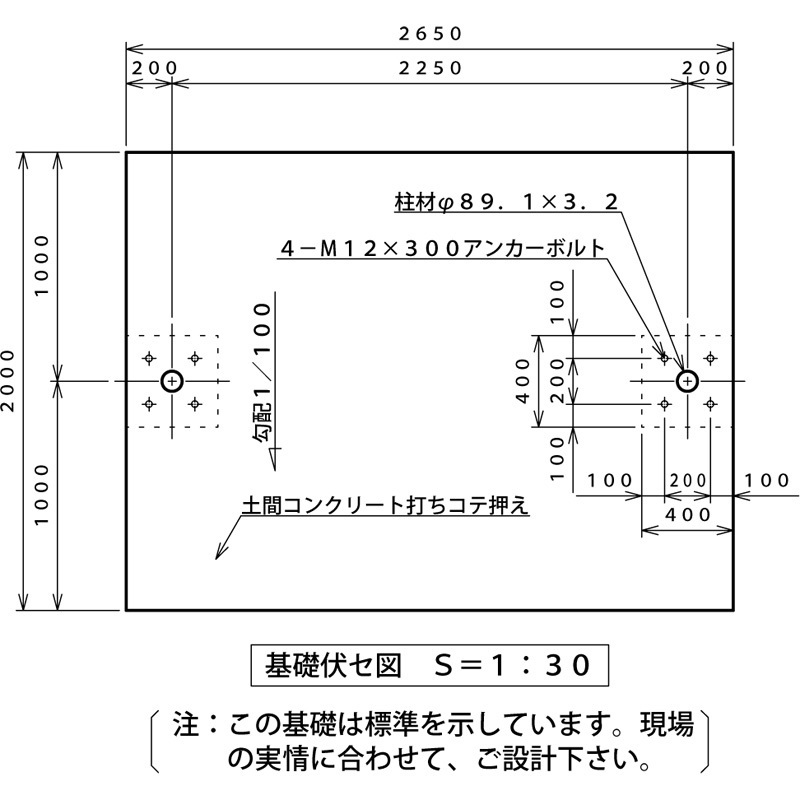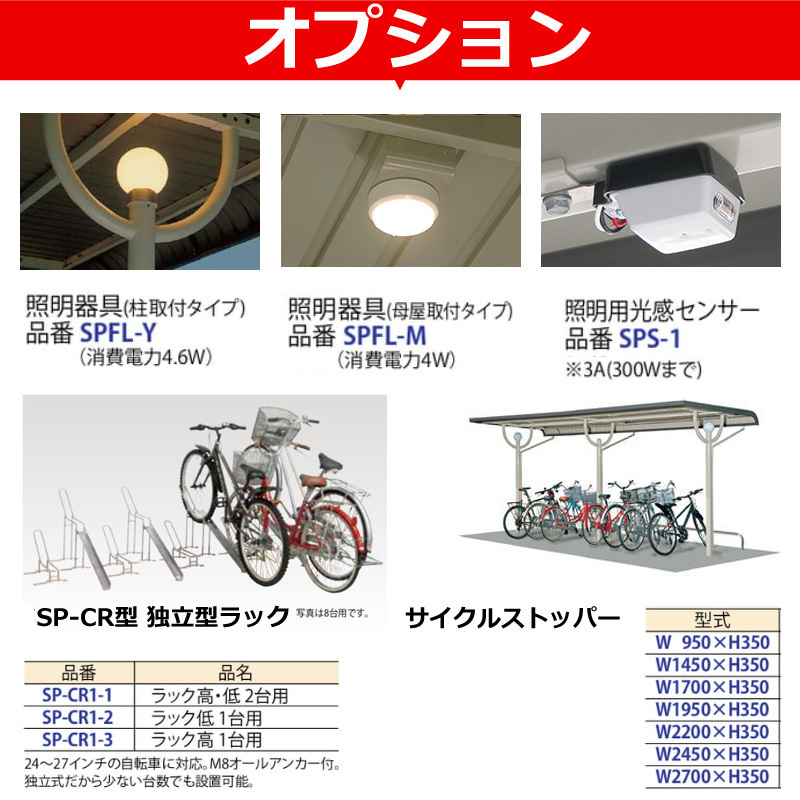 | 商品詳細 | この度は数ある商品の中から当商品を閲覧頂きまして有難う御座います。 販売価格 166,760円(送料・税込み) ●頑丈なガルバリウム鋼板屋根で強風、積雪にも耐えて自転車を守ります。 ●一般的なポリカ屋根タイプに比べて2倍の積雪40cmまで対応可。 ●腰板や照明器具などオプションと一緒に設置すると便利です。 ●骨組みはサビに強い高耐食溶融めっき鋼板ZAM仕様。 ●コストパフォーマンスにも優れ、店舗やマンション、アパートなどの駐輪場など、 さまざまな敷地条件に合わせて設置が可能です。 品番:SP101YP-K サイズ: 屋根間口2790mm(柱芯々間口2250mm)×屋根奥行き2000mm 高さ2283mm 駐車台数:4台(目安) 柱の施工方法:プレート仕様(アンカーボルトは現場にてご用意ください。) 耐積雪荷重:一般型1200N/m平方(120kgf/m平方) 耐風圧強度:Vo38(m/s) 屋根種類:ガルバリウム鋼板 骨組み:高耐食溶融めっき鋼板ZAM 重量:137.2kg 樋:標準装備 照明:オプション 柱位置:センター柱 柱形状:丸柱 屋根:後アール(R) 柱・骨組色:タウングレー 化粧板色:スレートグレー 屋根板色:タウングレー オプションにて腰板・照明器具・サイクルストッパー・自転車ラックがあります。 追加棟の設定も御座いますので横連結も可能です。 ご希望の場合は、お気軽にお問い合わせ下さい。 【ご注意】 ・垂直積雪量、および基準風速は自治体ごとに細かく決められています。 各都道府県庁または各市町村役場までご確認下さい。 ・耐風圧強度は、規格品の値です。奥行延長やオプションの腰板取付等の条件により 変わります。 SP101YP-K 仕様図はこちら SP101YP-K 梱包明細はこちら SP101YP-K 組立説明書はこちら SP101YP-K 基礎図はこちら SP101YP-K 取扱説明書はこちら |
