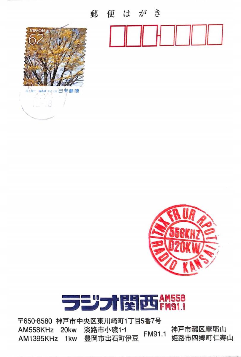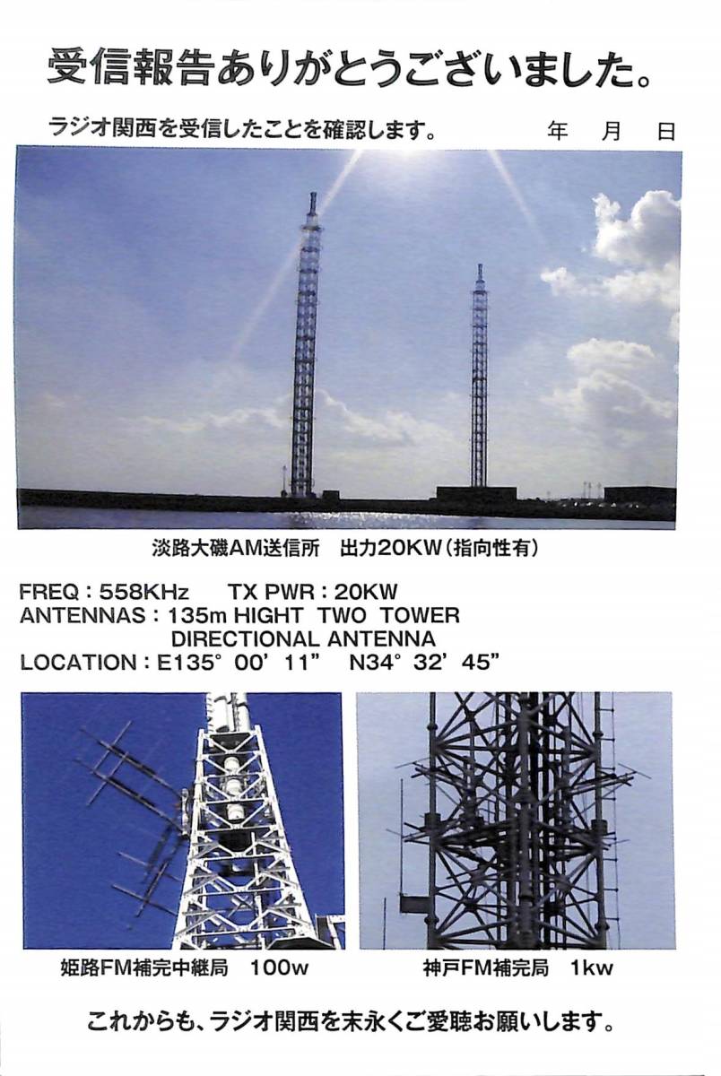 | 【商品名】・・・JOCR(★CRK・ラジオ関西)のベリカード。 ■当方、1枚のみ所有していますので即決で落札者様のコレクションになります! 【国名・地名】・・・日本★兵庫県。 【受信データ】・・・2019年1月24日・MW558KHZを受信。 【記載事項】・・・未記入。(★宛名ラベルをシールはがしで剥がしています) 【状態】・・・シワ、汚れ、シミ、焼け、ハゲ、色あせ等があります。 ■カードの状態は★画像を参考に判断して下さい。 ■この機会にぜひこのベリカードを貴方のBCLコレクションに加えて下さい! | |