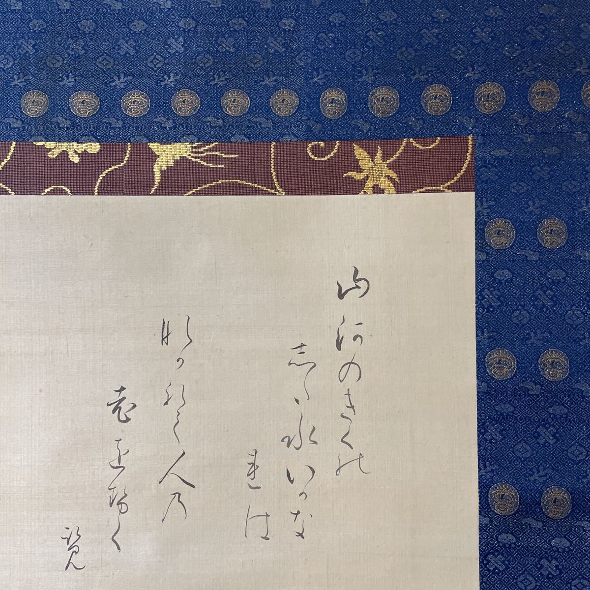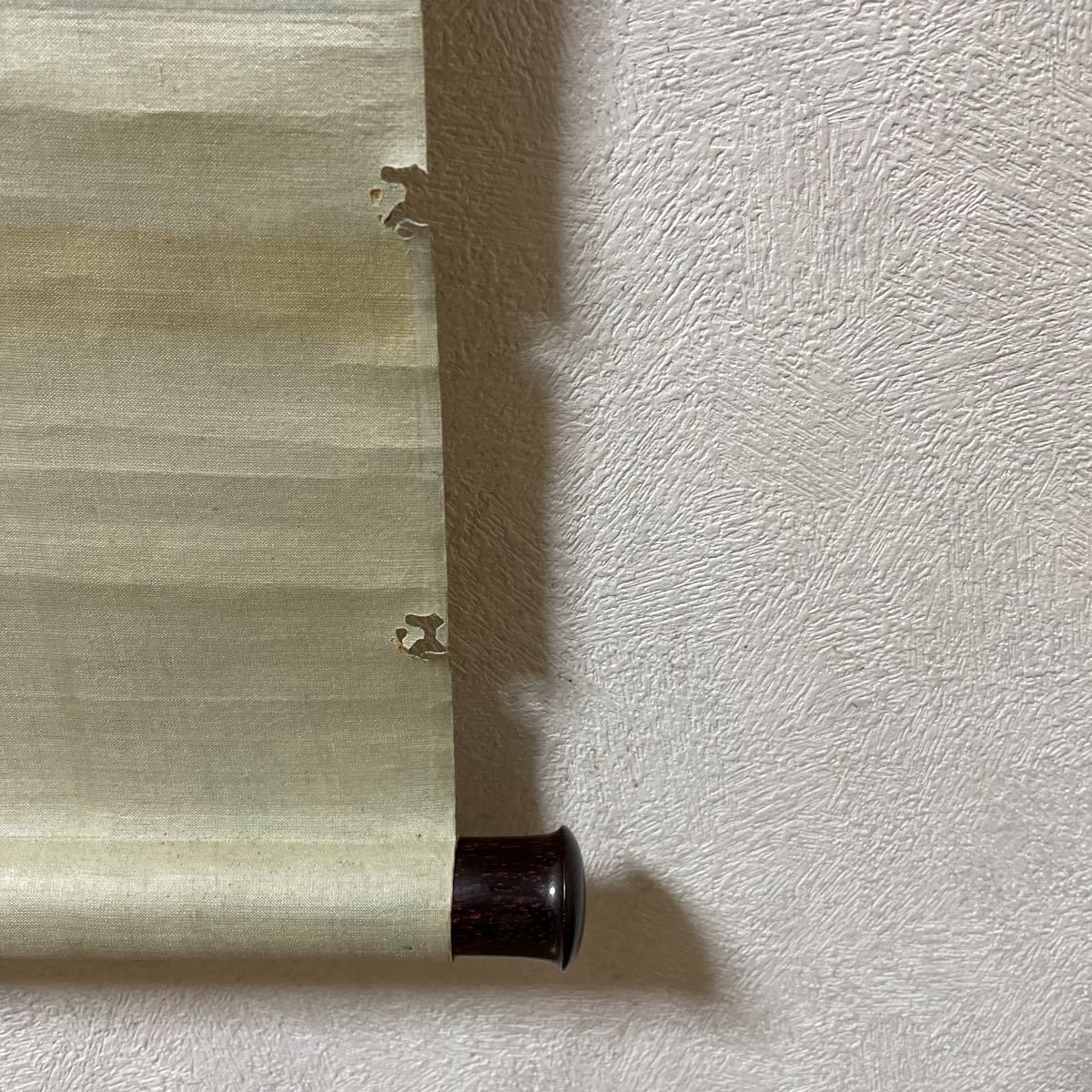 ・掛け軸の軸先は、昔のニカワ(天然接着剤)でくっつけているため、経年変化により外れやすくなっており、輸送の際に取れることもありますが、木工ボンドで簡単に修復できますのでご安心ください。