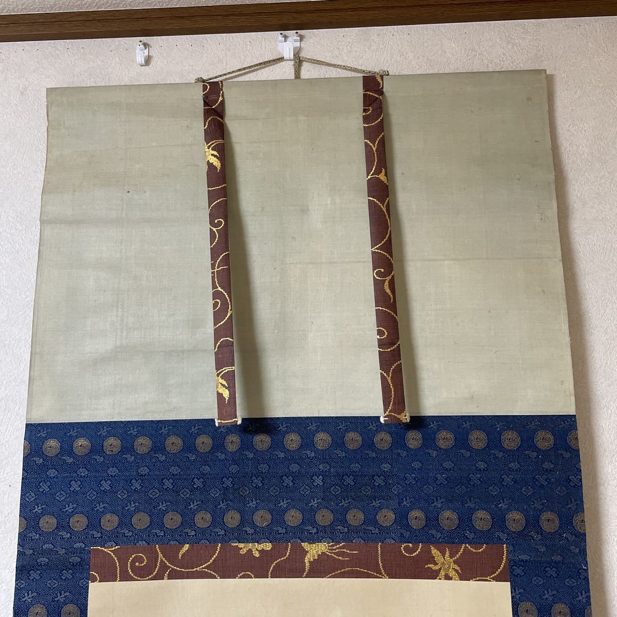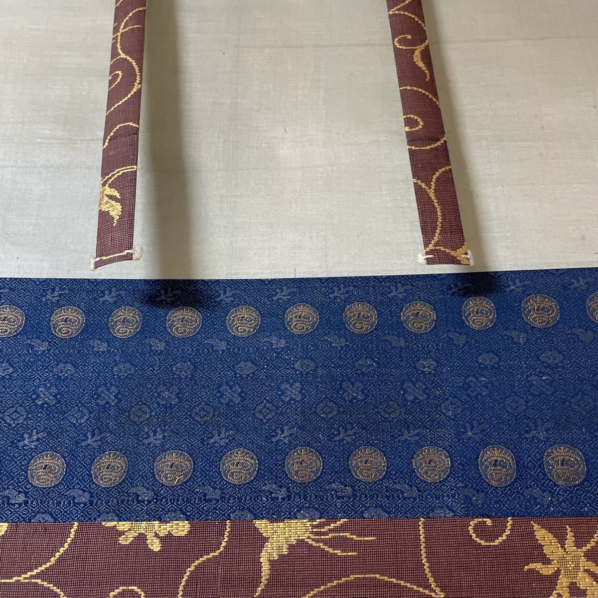 ・掛け軸の表装(絵以外の布)の状態=かなりの年代もののため、その年代のものとしては並。シミシワ汚れキズ等あり。右端に虫食い跡あり。(詳しくは写真ご参照)。