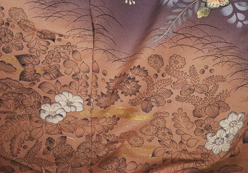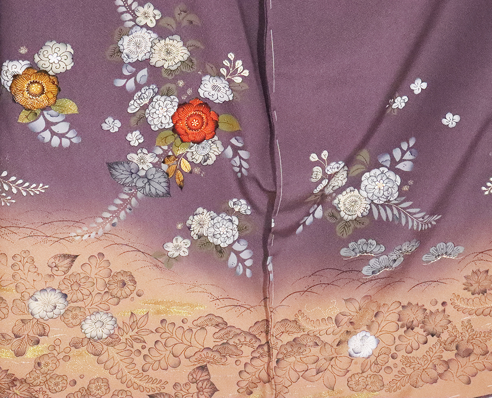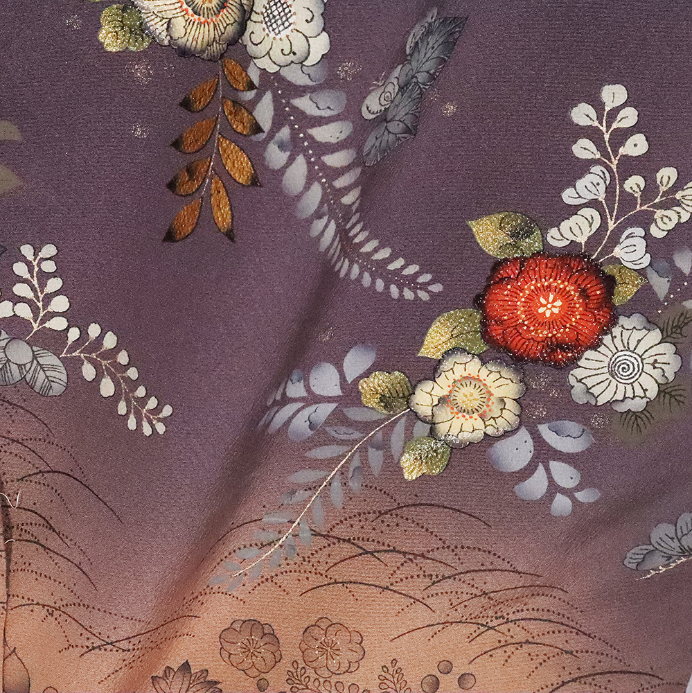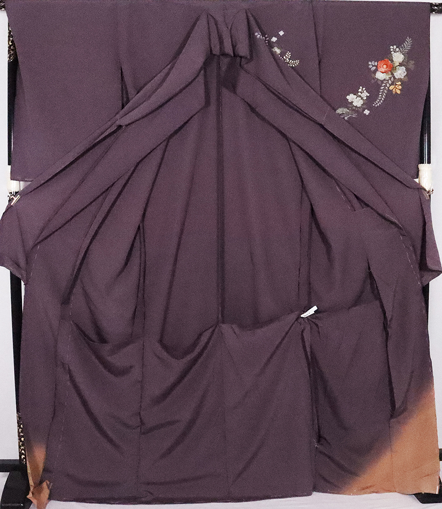 | 仮絵羽 訪問着 丹後縮緬地 赤紫・茶色ぼかし地辻が花 一部刺しゅう 広襟 八掛け付き 未仕立て 新品 仕付け付き | |
