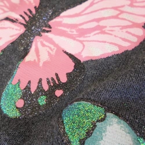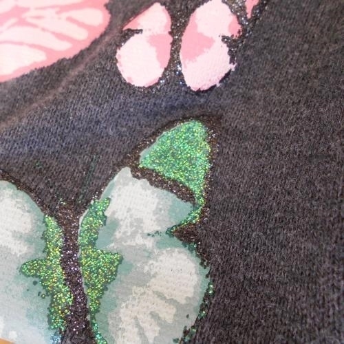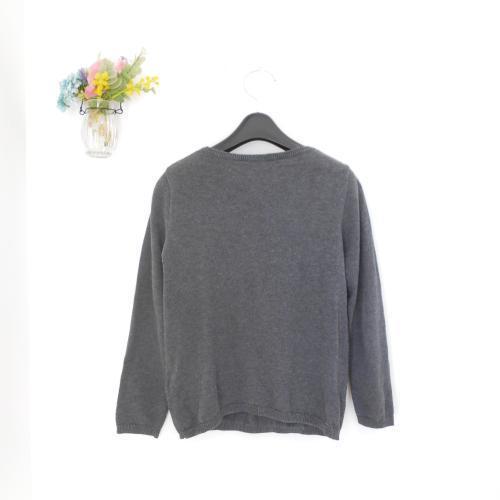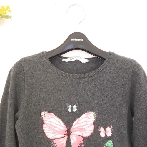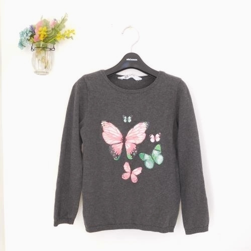 H&M エイチアンドエム キッズ 女の子 コットン100%の長袖ニットのトップスです。お色は濃い目のグレーにピンクやグリーンの蝶・バタフライラメ入りの綺麗なトップスです。