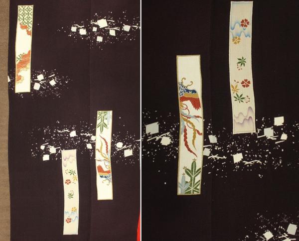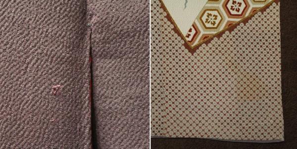 右おくみの裾に7cmのしみがあります。後ろ右身頃の背中脇近くに糸が出ている箇所あります。