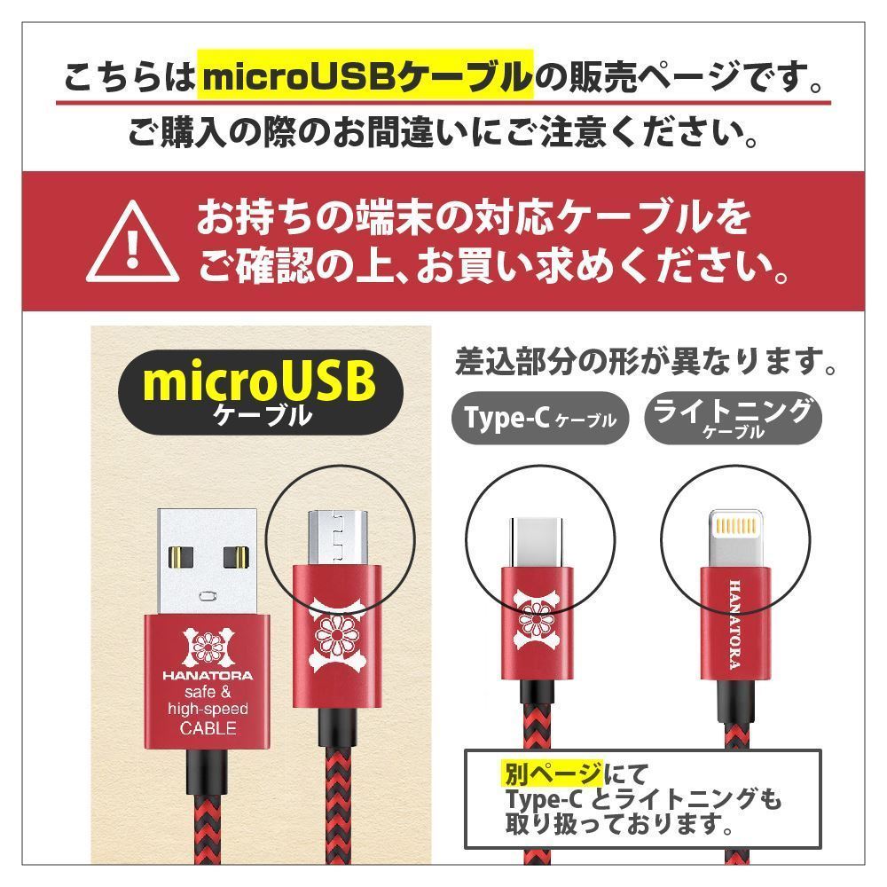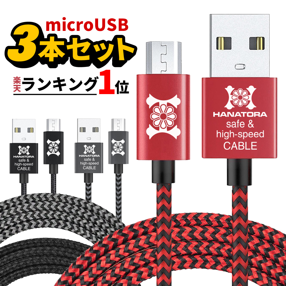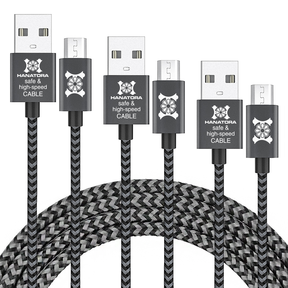 【HANATORA】Micro USBケーブル 3本セット 急速充電 高速データ通信 高耐久 ナイロン編み メッシュタイプ 0.3m+1.2m+2.0m グレー 997809