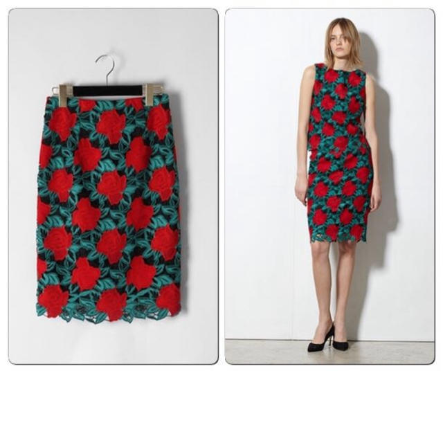 オリジナルのフラワー刺繍レース素材を使用した膝丈スカート。